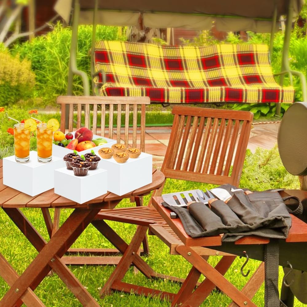 【Sturdy Construction】: Constructed from high-grade ABS acrylic plastic, these cube boxes are both durable and lightweight. They are designed to be strong and stable, ensuring that your dishes and decorations are secure and well-supported throughout your gathering. The risers display stands can withstand the rigors of frequent use while maintaining their sleek and modern appearance.