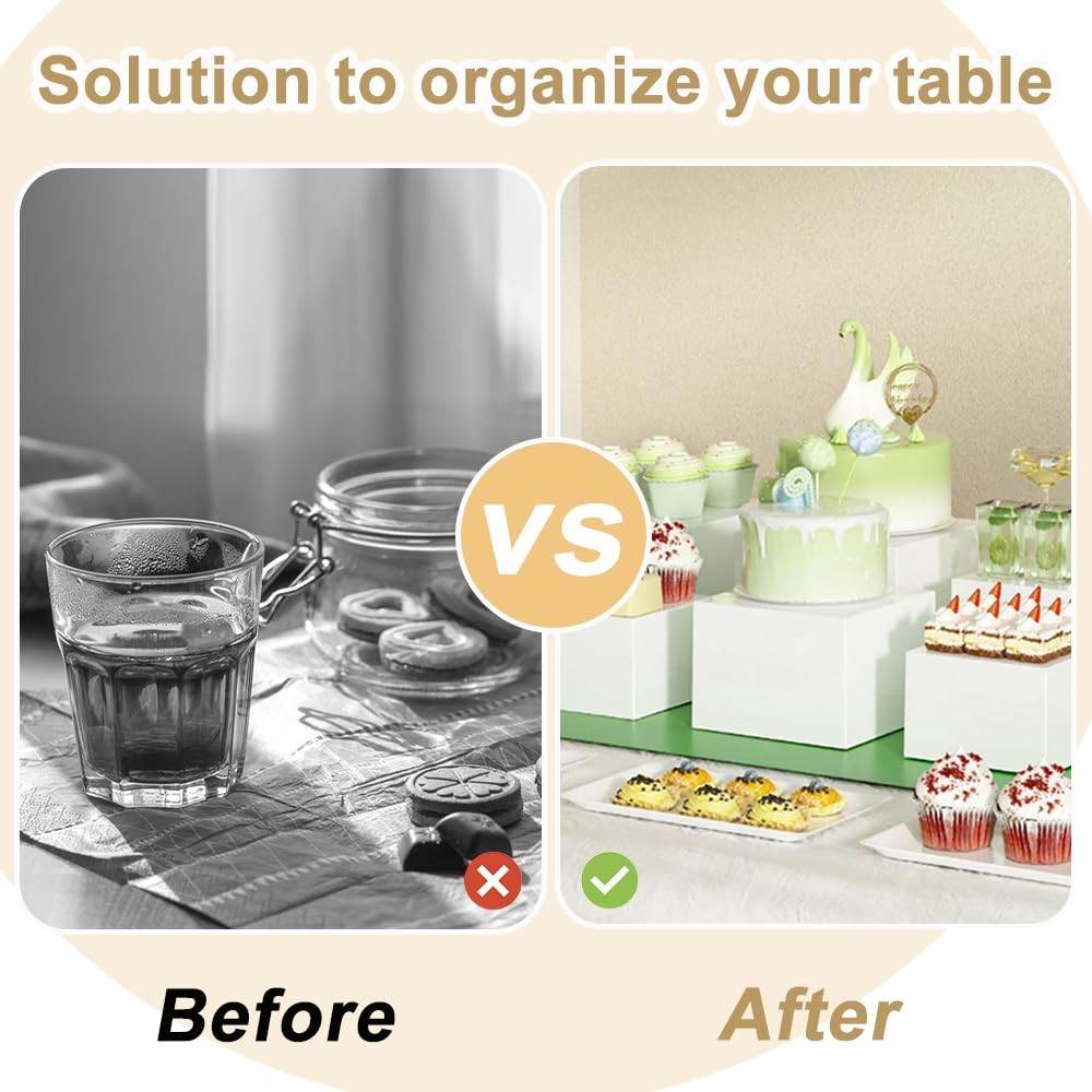 【Innovative Storage Solution】: Each dessert table display with hollow bottoms can be inverted to serve as a storage box, providing additional utility and convenience. This dual-purpose design allows you to store small items or even the acrylic risers themselves, making organization and cleanup a breeze.
