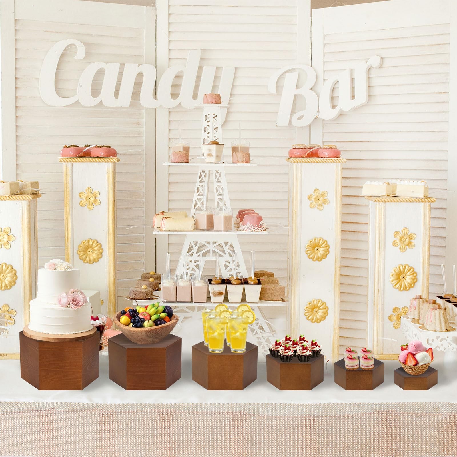 【Innovative Storage Solution】: Each dessert table display with hollow bottoms can be inverted to serve as a storage box, providing additional utility and convenience. This dual-purpose design allows you to store small items or even the wooden risers themselves, making organization and cleanup a breeze.