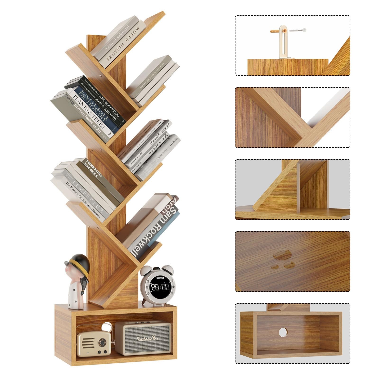 Sturdy: The tree bookshelf is made of particle board, which has a tough texture. And the bookcase backboard has been reinforced, which has strong load-bearing capacity. For added safety and stability, we offer anti tip straps that allow you to secure floor standing bookshelf to the wall