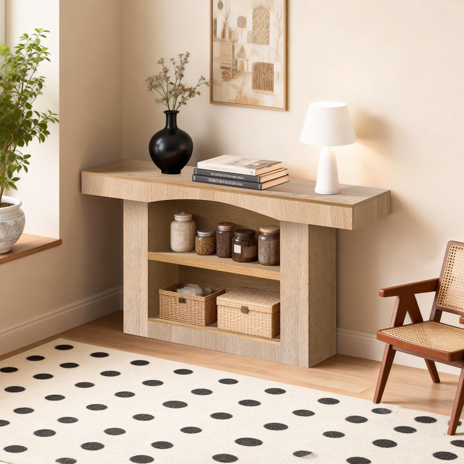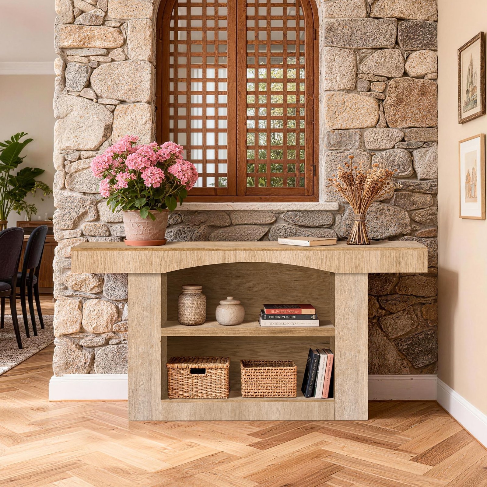 3、Versatile Style - With its minimalist elegance and rich wood grain texture, this entry table creates a warm and inviting atmosphere. Whether your home features farmhouse, modern, or transitional decor, it blends seamlessly with a variety of interior styles.