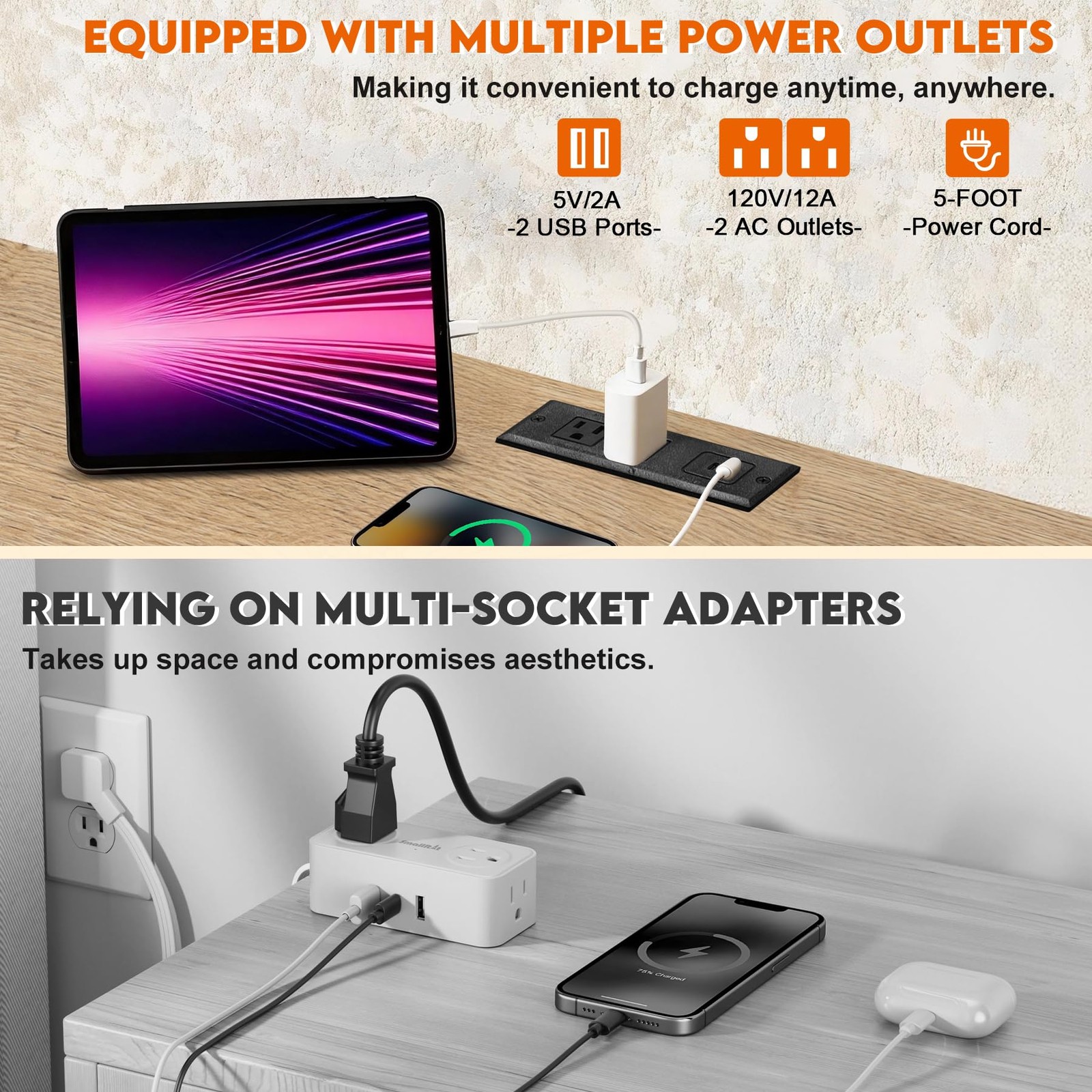 4、Power Outlet - This console table is equipped with 2 additional AC outlets and 2 USB charging ports. This allows you to easily charge your phone, tablet, earbuds, and other devices, contributing to a more efficient and connected lifestyle at home.