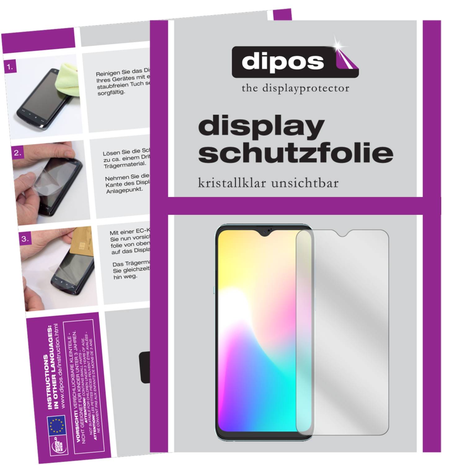 Modern silicone adhesion ensures that the film attaches itself to the display and can be applied without forming bubbles. Small bubbles can be easily pushed to the edge. Adhesion is achieved completely without glue, which means the dipos film can be removed even years later without leaving residues behind and without slipping during use.