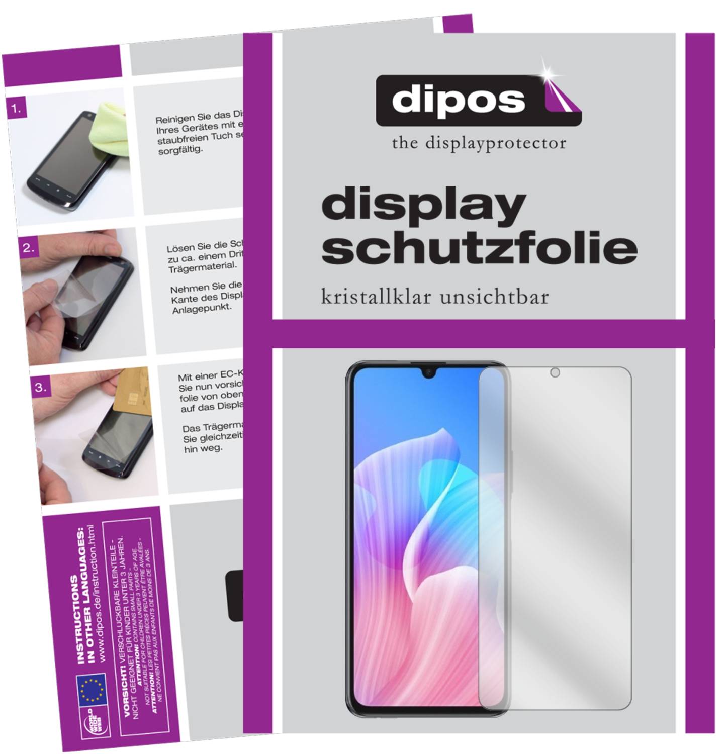 Modern silicone adhesion ensures that the film attaches itself to the display and can be applied without forming bubbles. Small bubbles can be easily pushed to the edge. Adhesion is achieved completely without glue, which means the dipos film can be removed even years later without leaving residues behind and without slipping during use.