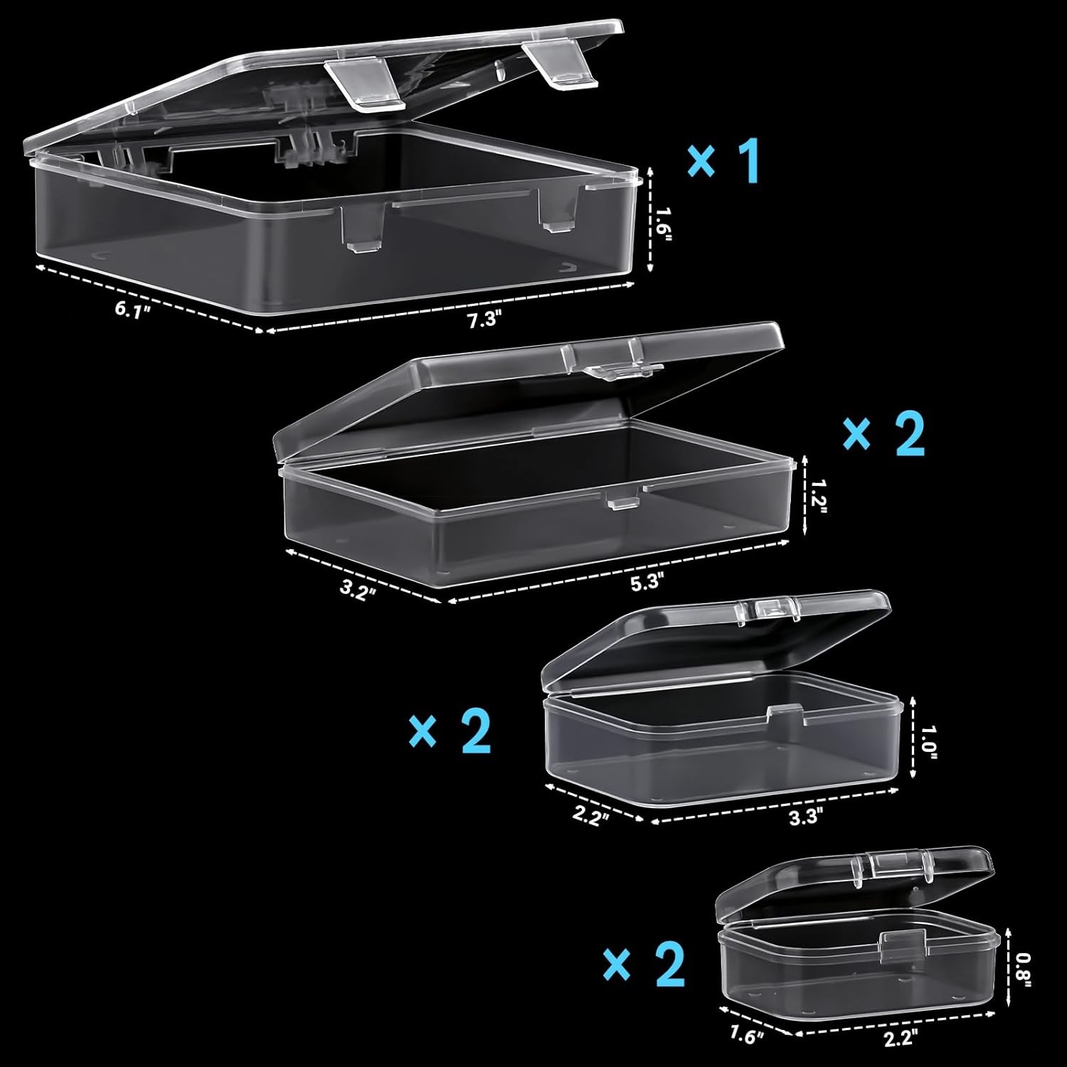 5 Mixed Sizes: Each plastic box measures 7.3x6.1x1.6 inches, 5.3x3.2x1.2 inches, 3.3x2.2x1.0 inches and 2.2 x 1.6 x 0.8 inches; Different sizes make it suitable for organizing small items, which can satisfy your various needs for replacement and sharing