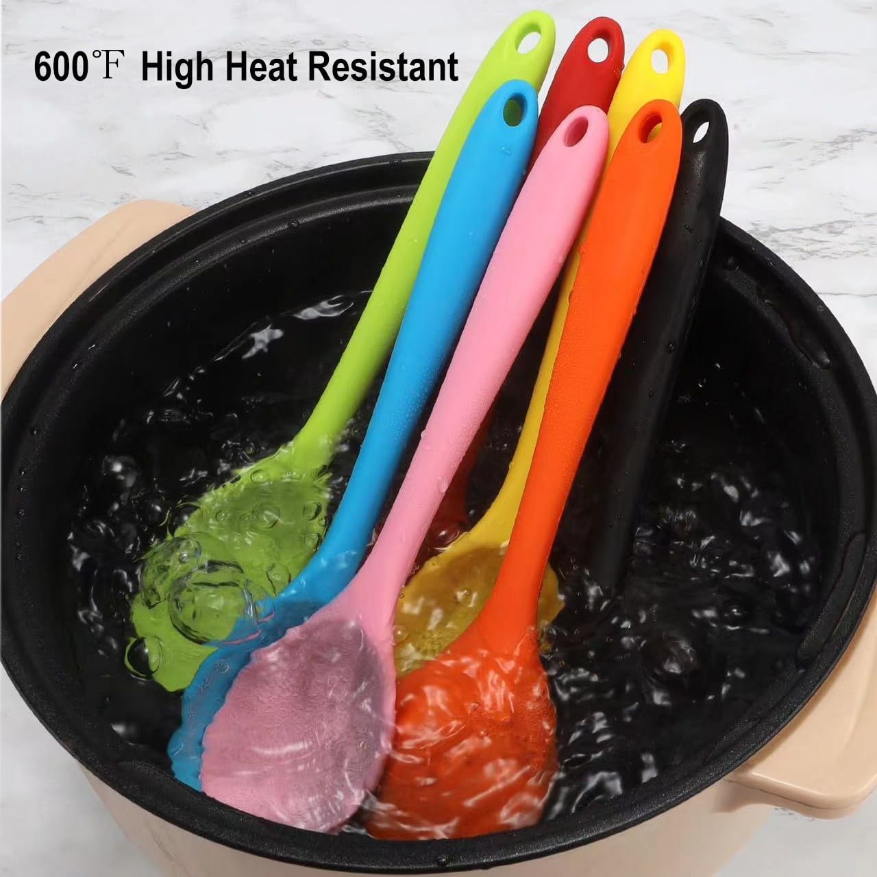 - Measurement: The heat resistant silicone basting spoon size is approx. 8inch in length, proper size for you to handle, designed with a hole at the end of the colorful serving spoon, which allows you to hang it from to dry, occupies little space, avoids water gathering