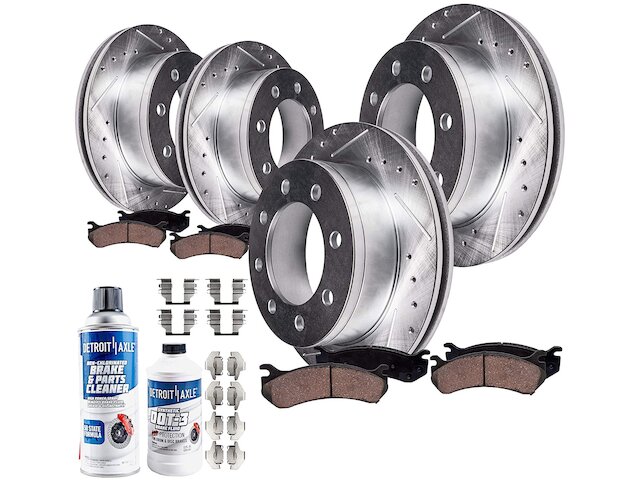 Features:- Kit Includes: (2) Front Drilled Slotted Brake Rotor + (2) Rear Drilled Slotted Brake Rotor + (2) Front Ceramic Brake Pad + (2) Rear Ceramic Brake Pad + (2) Brake Fluid & Cleaner