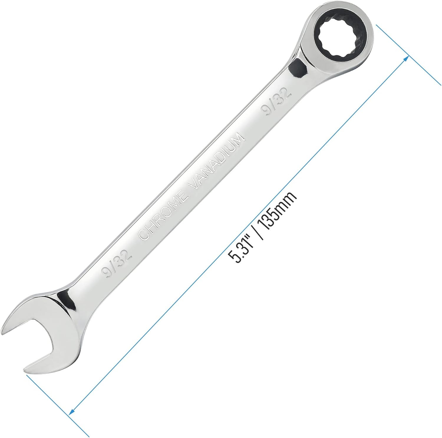【Size and Packing】Both ends of wrench include box end ratchet head and Open head with steel stamped size mark 9/32", Package include 1 piece.