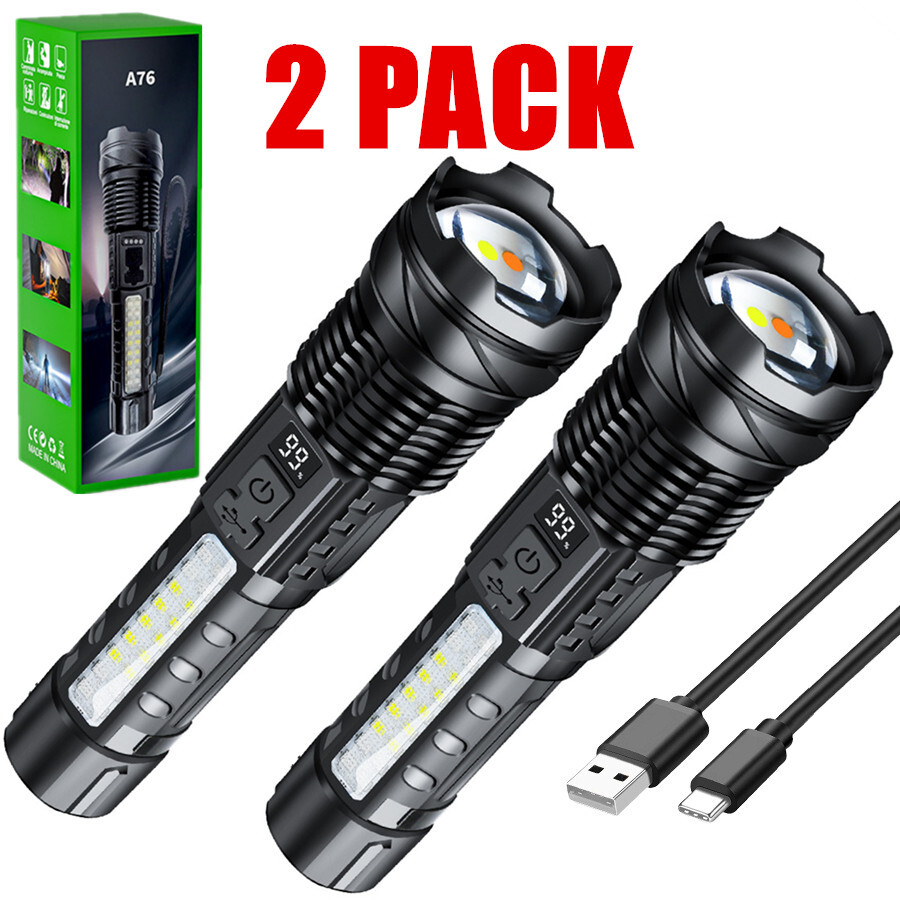 【USB Input and Power display 】 Rechargeable flashlight has an Type-C input port and power display. Support USB charging. You can charge with a laptop, car charger, charging treasure, etc.