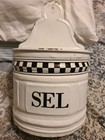 ANTIQUE JAPY Enamel SEL Salt Canister White with Blue Hinged Lid/ FRANCE
