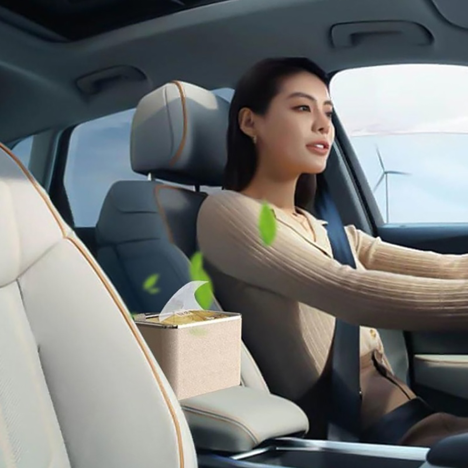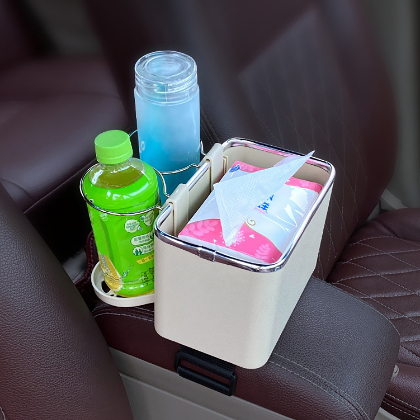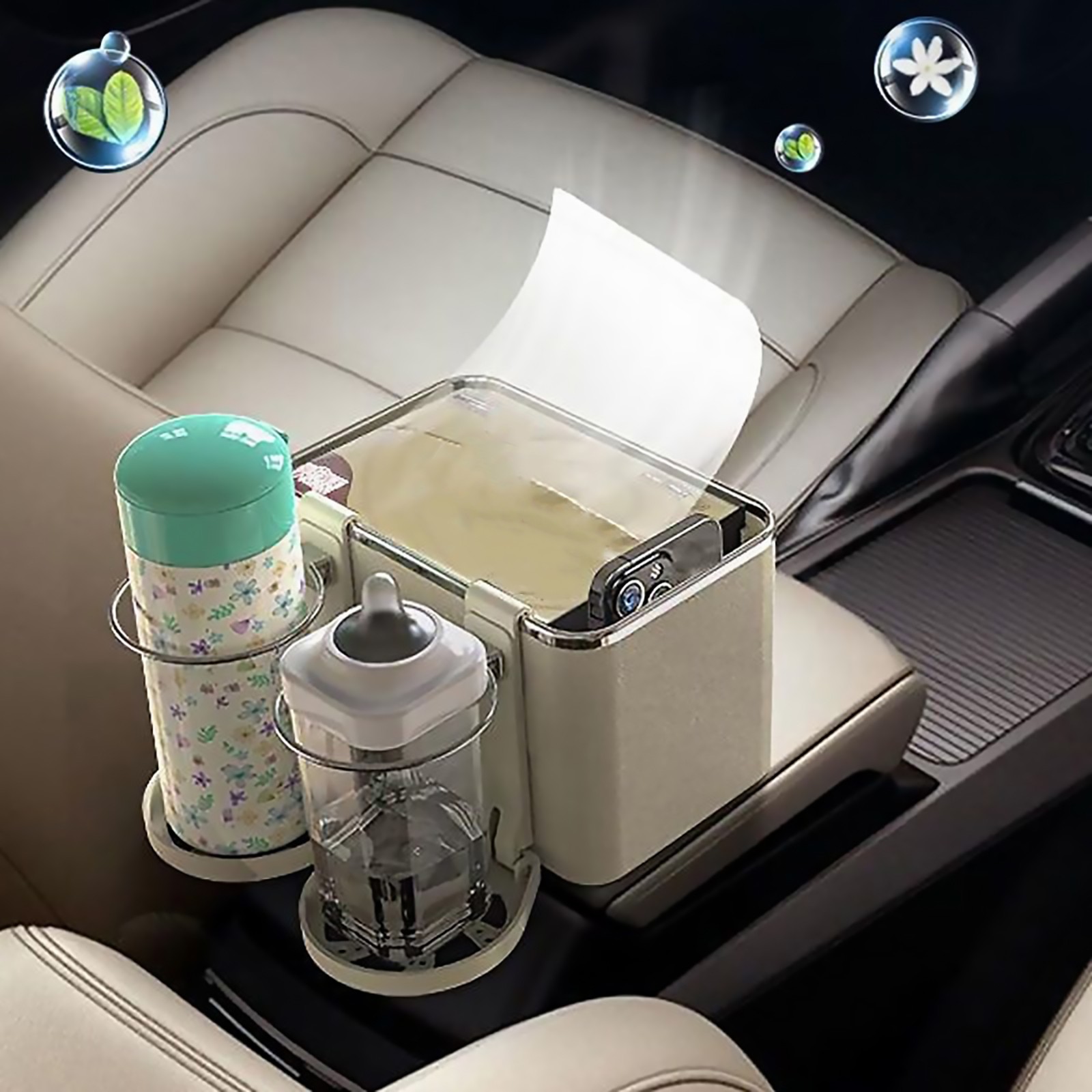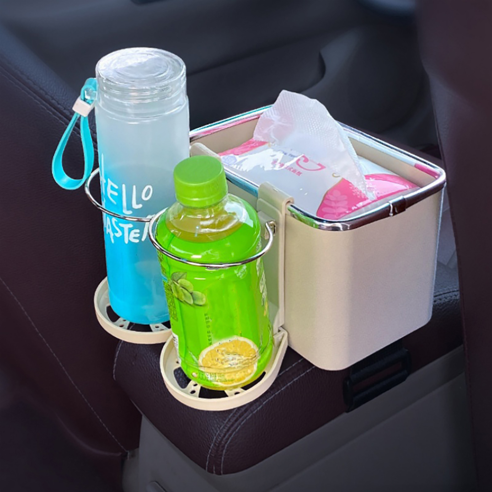 Multifunctional Car Armrest Storage Box Organizer: 3 Independent Spaces. Drivers don't need to look for their phones while driving, and for paper towels wet tissues snacks water cups, coffee, beverages, drinks, sunglasses, or others.
