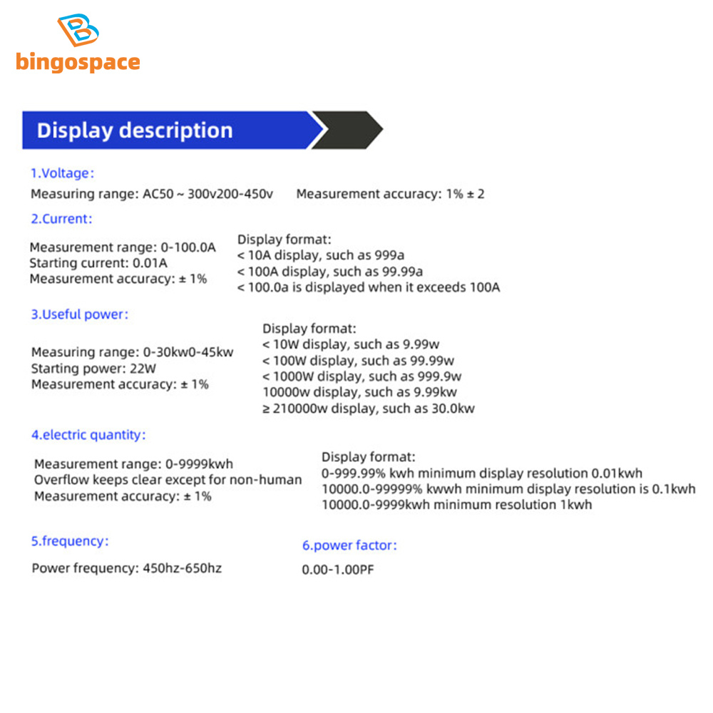 Alternating current: AC0-99.99A, current display resolution is 0.01A, when it exceeds 100A, it will display 100.0A