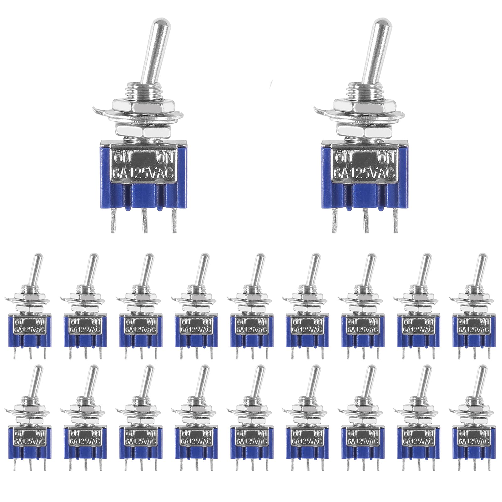 Specification: Position: 2 Positions (ON/ON) Total Height: 33mm/ 1.30inches Mounting Hole Diameter:6mm/ 0.23inches Rating: AC 125V/6A Connector Type: SPDT Material: Metal, Plastic Pin Number: 3 PinsPackage Contents: 20x 3 Pin 2 Positions Mini Toggle Switch