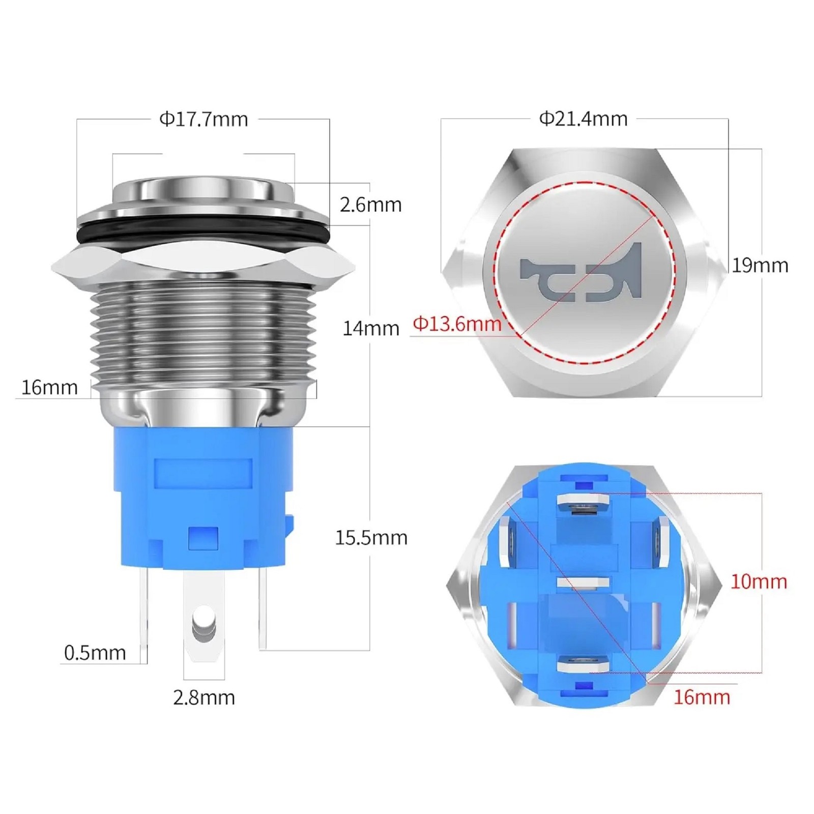 Dimensions: 16mm body diameter, 17.7mm bezel diameter, 13.6mm button diameter, total length 32mm