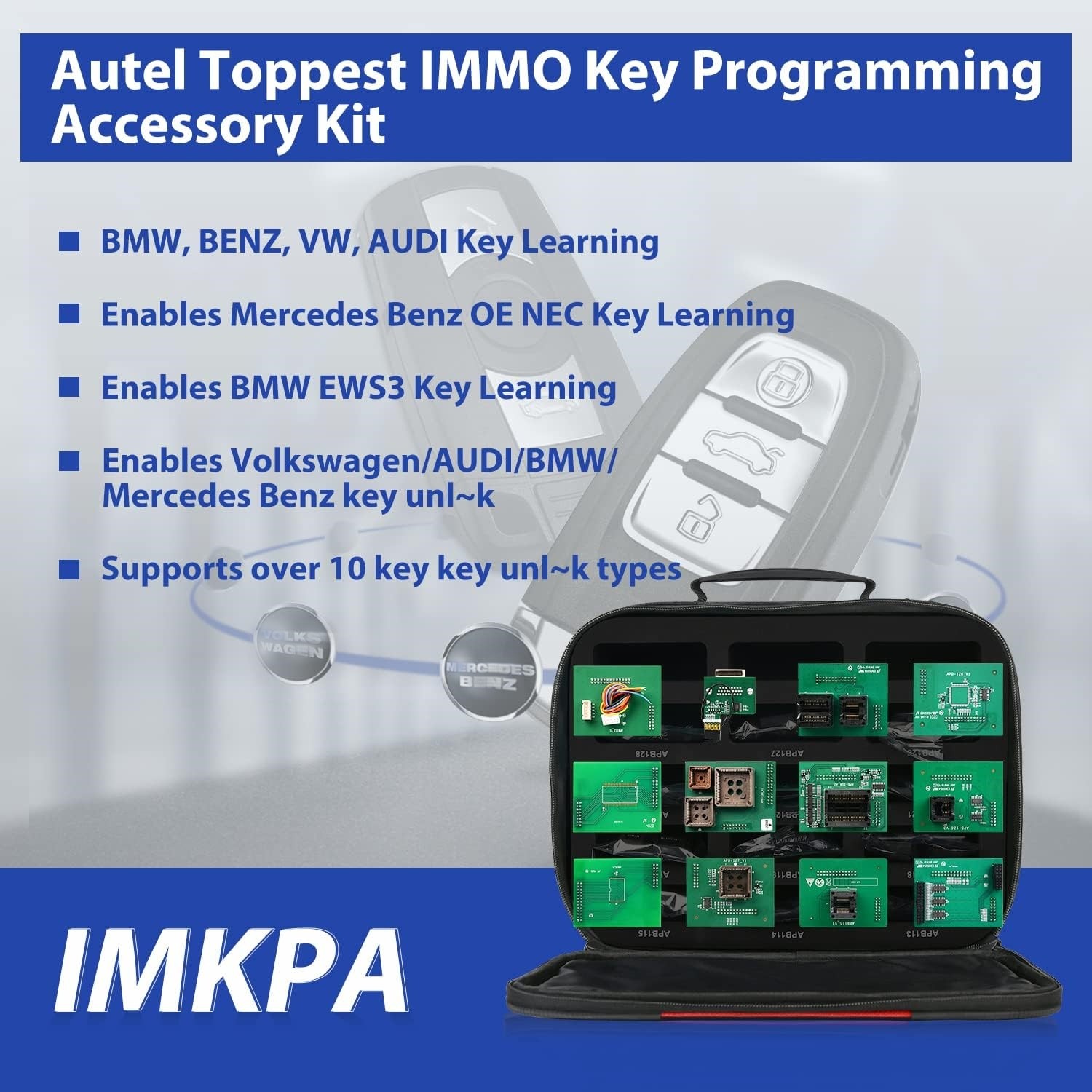 Autel IMKPA K-ey Progarmming Accessories Kit to Use with XP400 Pro IMKPA is a Progarmming Adapter Kit, compatible with the XP400Pro & Chip Progarmmer. Includes 12 adapters for the XP400Pro that enable Read/Write/Erase for Mercedes Benz ESL_W209 / W906 Data, for Mercedes Benz NEC Learning, for BMW EWS3 Learning and. For V*olks*wagen/For AUDI/For BMW/For Benz Unl~k. Compatible with the IM608PROKPA / IM608 and IM508 with XP400Pro. NOTE: IMKPA is only compatible with XP400 Pro as well as 2024 newest version of IM608 (XP400), IMKPA can NOT extend the progarmming function when using with old XP400 or XP200. About this item 【2025 ADVANCED FOB PRO-GARMMING KIT - WORKS WITH IM608/ IM608 II/ IM608S II/ IM608 Pro II/ IM508S/ XP400 PRO】As the most advanced fob progarmming accessory kit to date, Autel IMKPA Kit can work with 2024 Newest MaxiIM IM508/ IM508S/ IM608/ IM608 II/ IM608S II/ IM608 Pro II to do advanced progarmming for BEZN/ BMW/ V*W/ AUDI, etc. 【ADVANCED PROGARMMER FOR BENZ/ BMW/ AUDI/ V*W/ ETC】Autel IMKPA Kit enables read/ write/ erase for Mercedes Benz ESL_W209 / W906 Data, Mercedes Benz OE NEC Learning, BMW EWS3 Learning, Vo*lks*wagen/ AUDI/ BMW/ Mercedes Benz u-nlock, it supports over 10 u-nlock types. 【12 ADAPTERS INCLUDED - PROFESSIONAL FOR MECHANICS】Autel IMKPA Kit includes 12 Adapters, compatible with the XP400 Pro to expand XP400 Pro’s progarmming capacity. Adapter Kit includes: APB113, APB114, APB115, APB118, APB119, APB120, APB121, APB122, APB123, APB126, APB127, APB128. 【WORK WITH IM508S PRO (IM508S+XP400 Pro), GET SAME IM608 PRO II/ IM608 II/ IM608S II/ IM608 Pro II FUNCTIONS】If the budget is limited, you can choose this suit: IM508+XP400 Pro (also called IM508 PRO) plus IMKPAT combination to get the same full IMMO progarmming capability as the latest IM608 Pro+IMKPA, definitely is the most competitive and cost-effective progarmmer combo in the market! Product Description Autel IMKPA is a progarmming adapter kit, it can work with XP400 Pro+IM508/ IM608(Pro)/ IM608PROKPA to enhance the IMMO functions for BENZ/for BMW /for Adui/ for V*W, etc. Such as below: Enables Read/Write/Erase on Mercedes Benz ESL_W209 / W906 Data Enables For Mercedes Benz OE NEC Learning Enables For BMW EWS3 Learning Enables For V*olks*wagen/For AUDI/For BMW/For Mercedes Benz Unl~k Supports over 10 unl~k types Compatible with IM508 and IM608 (XP400Pro required) Includes 1-Year Warranty Package includes: 1pc x APB113 1pc x APB114 1pc x APB115 1pc x APB118 1pc x APB119 1pc x APB120 1pc x APB121 1pc x APB122 1pc x APB123 1pc x APB126 1pc x APB127 1pc x APB128 1pc x Storage Case