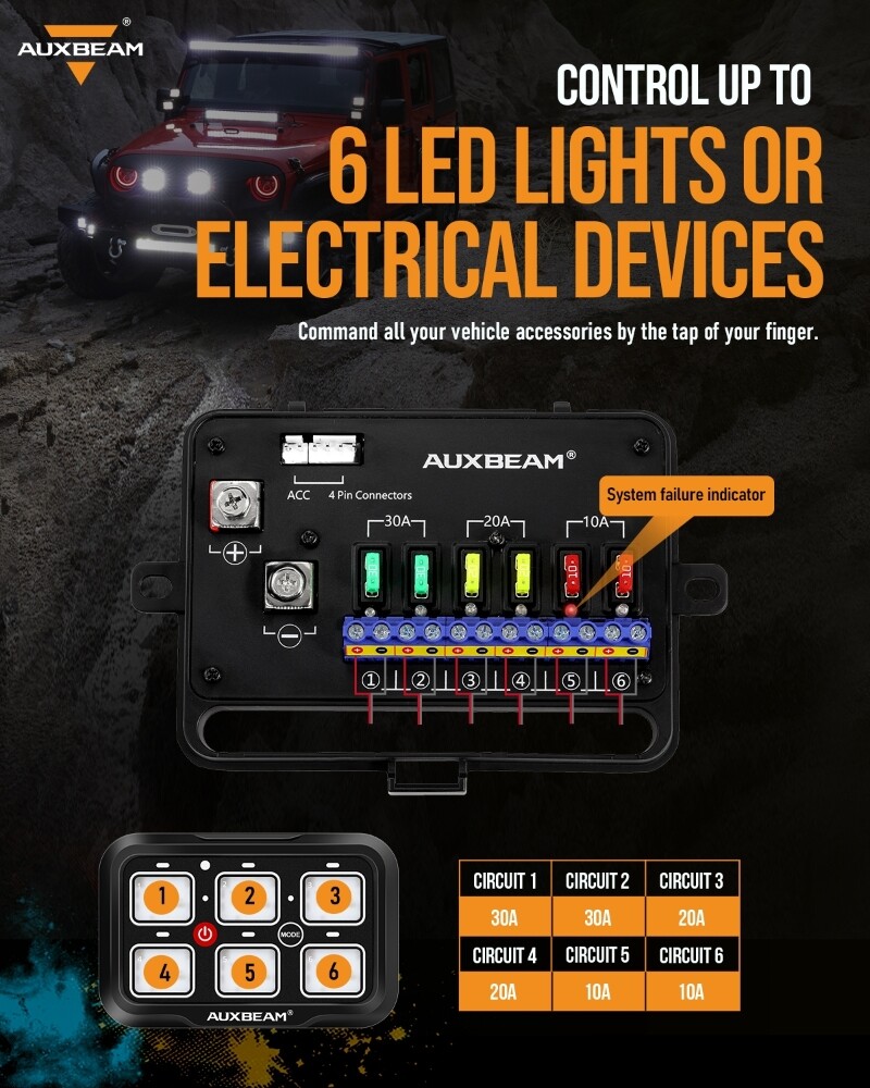 6-Gang one-sided outlet switch panel. It allows you to control up to 6 different LED lights or devices. Command all your vehicle accessories by the tap of your finger.