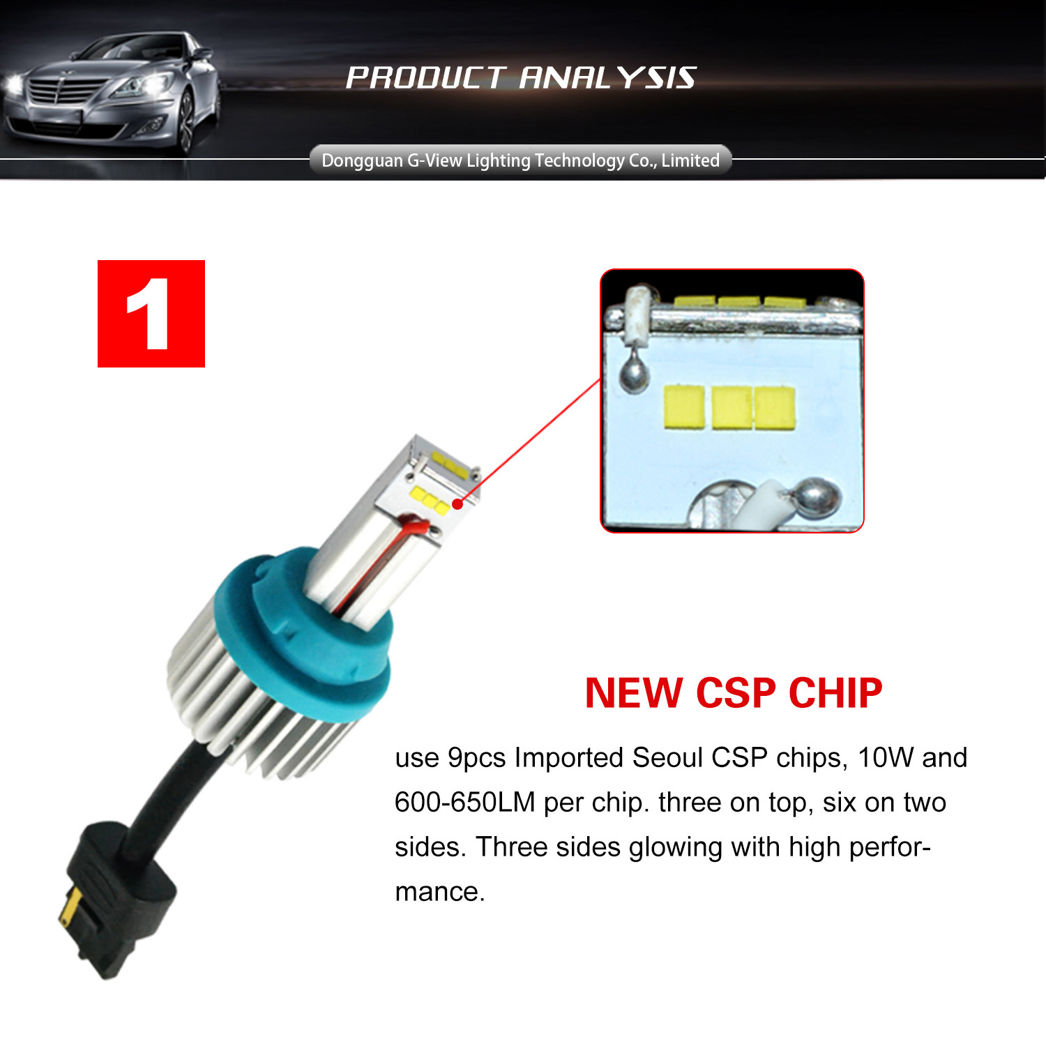 - (Set of 2) Fully 2 Years Warranty. 1300 lumens per bulb, total 2600 lumens. Chips: 9 pieces high quality,high power with high performance CSP led chips per led bulb ---360 degree full angle illumination with projector lens design