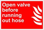 Horizontal Metal Sign Multiple Sizes Open Valve Running Hose Fire OSHA ANSI Red
