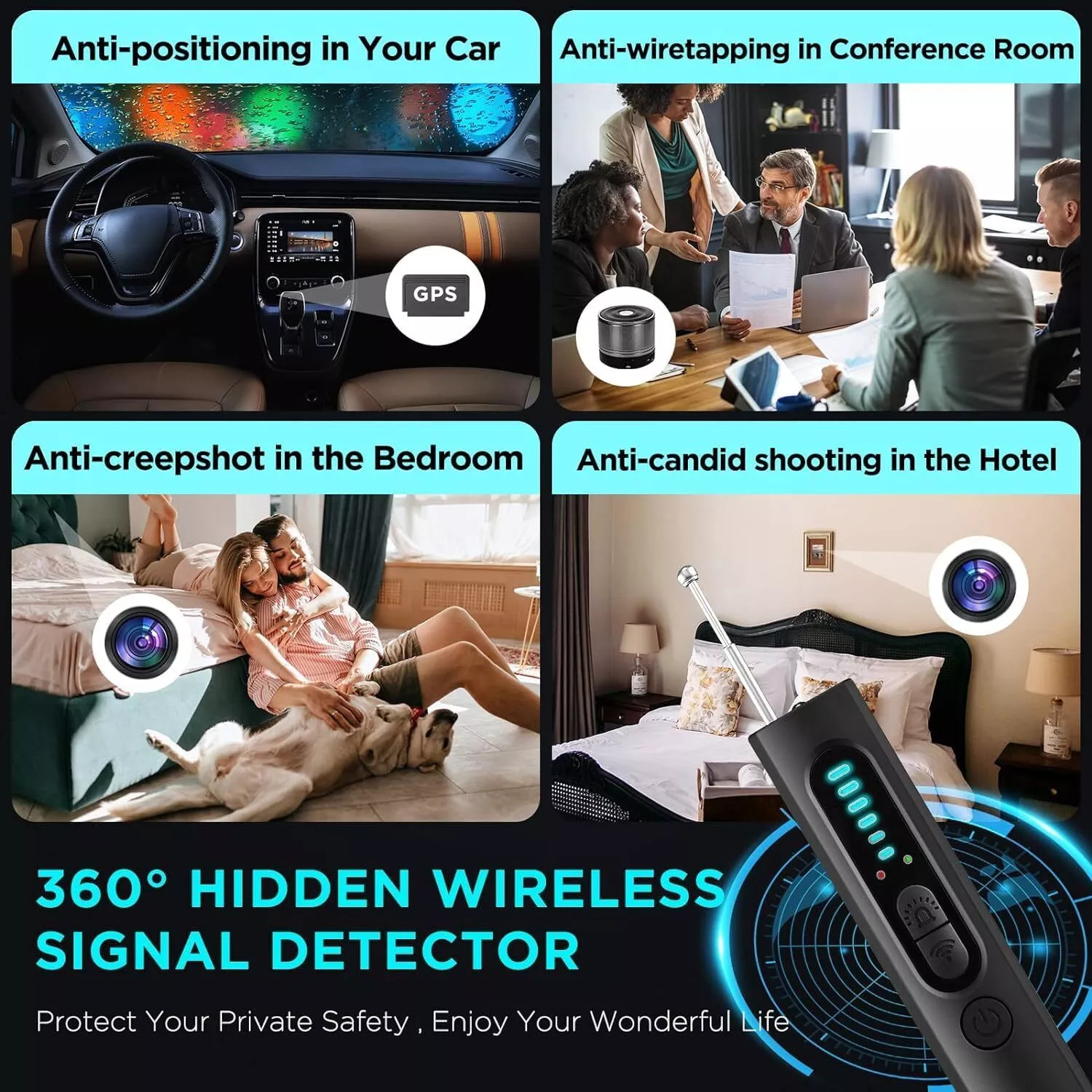 ✅【Lightweight and durable】The invisible camera detector won't weigh you down. With its efficient design, our detector provides a simple and hassle-free experience and is very easy to carry and use. You can use it in locker rooms, conference rooms, bathrooms, hotels, rental houses, offices and many other places to protect your personal privacy and important information anytime and anywhere