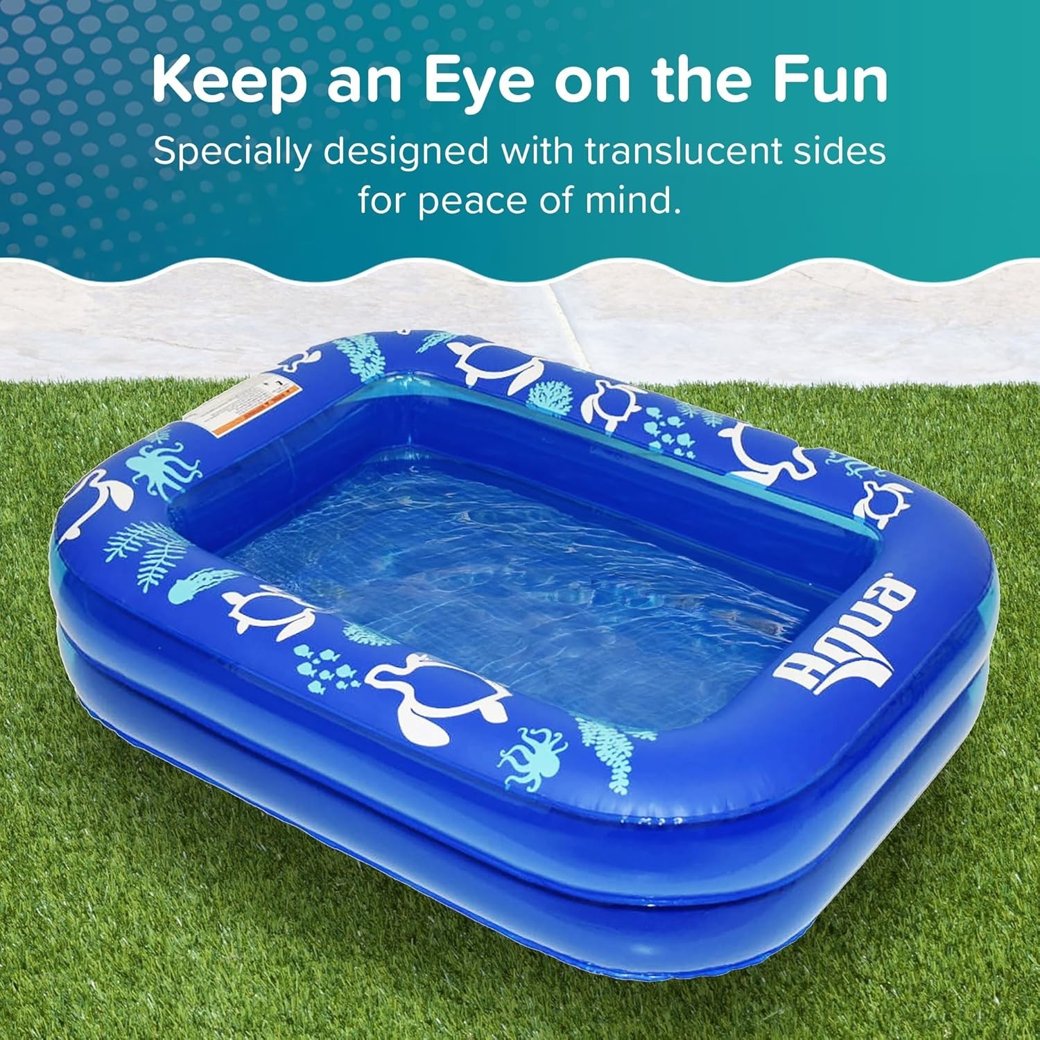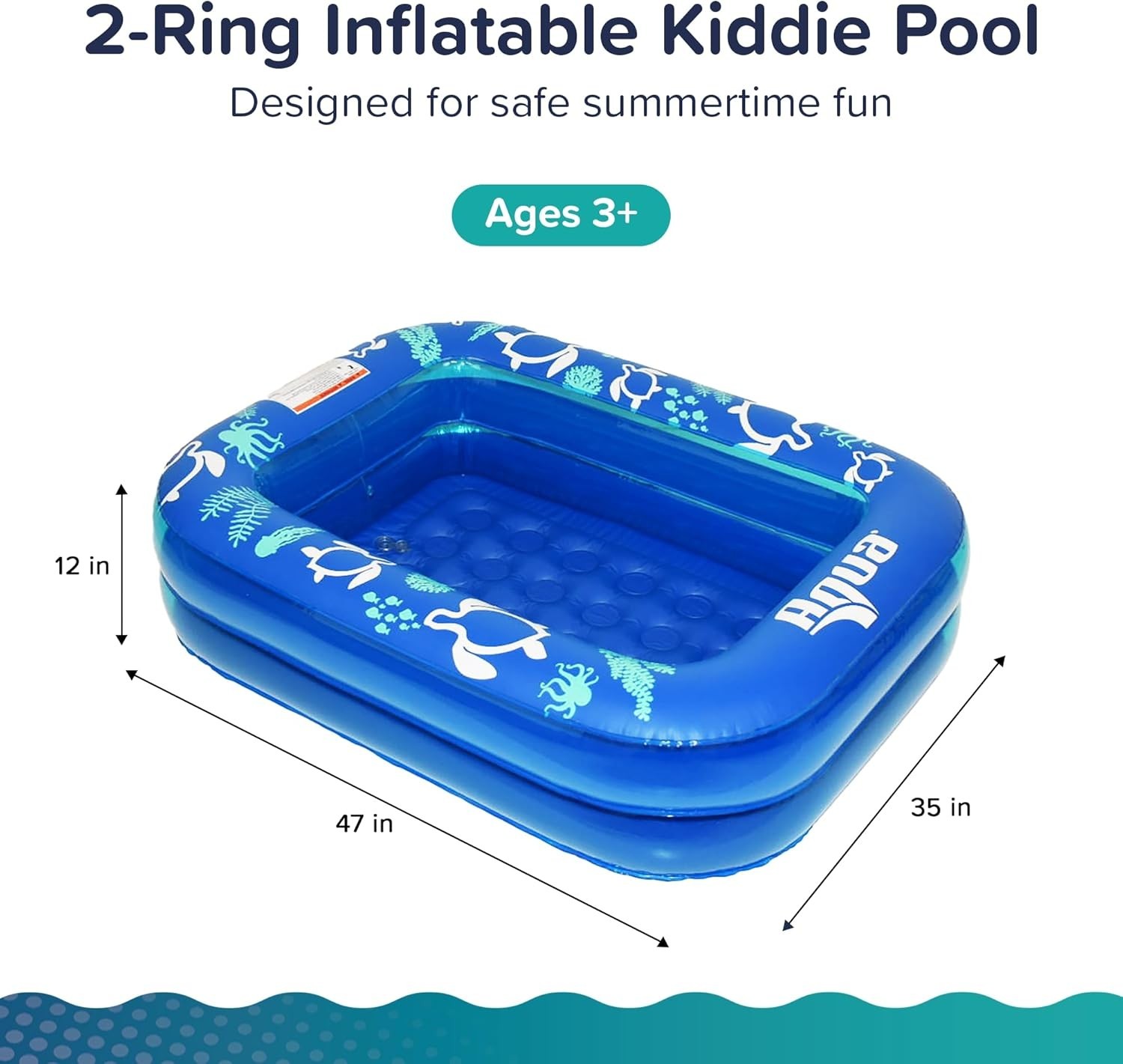 2-Ring Design for Extra Stability: This inflatable pool features a 2-ring construction for added stability and safety, providing a secure play area for your child Clear Translucent Sides: The specially designed translucent sides allow you to easily monitor your child, ensuring peace of mind while they play in the water Comfortable Cushioned Bottom: The cushioned bottom layer adds extra comfort, making this pool a cozy and fun space for kids to splash around Vibrant Aqua Animal Designs: Featuring playful aqua animal designs, this pool adds a fun, colorful touch to your child's summer activities Portable & Easy to Use: Measuring 47” x 35” when inflated and 12” in height, this pool is easy to inflate, deflate, and transport, making it perfect for travel or at-home fun