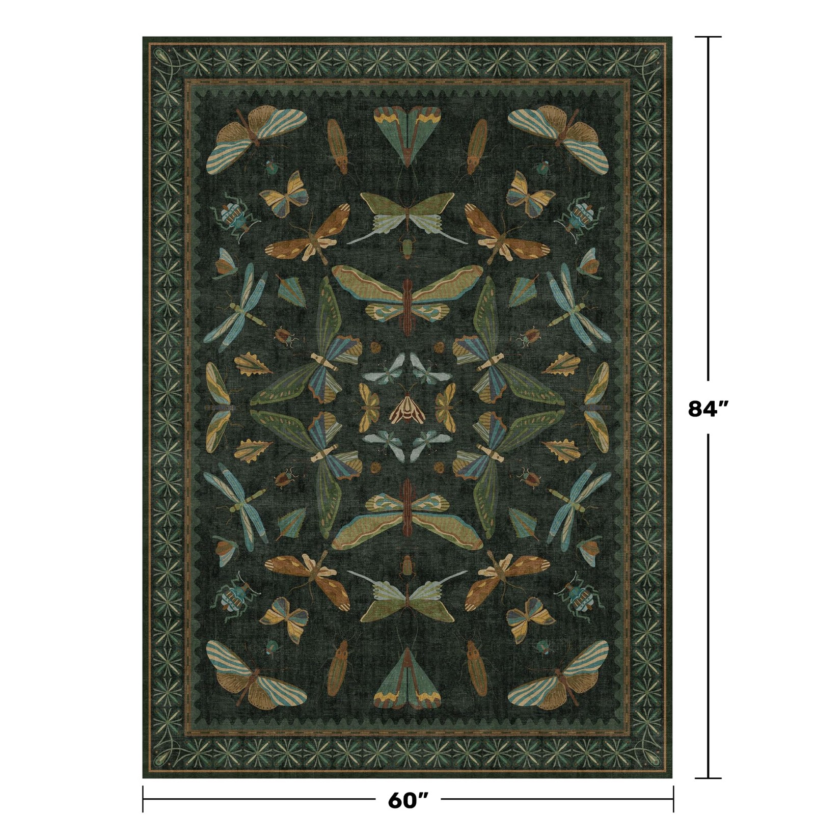 - Dark Moody Design:This area rug features a rich dark green backdrop with a mirrored arrangement of whimsical insects moths, beetles, and dragonflies in earthy tones of gold, teal, and rust. Delicate scalloped borders frame the central kaleidoscopic layout, while the vintage floral outer edge adds a folk-art charm. Ideal for eclectic, woodland, or cottage-inspired interiors, this rug brings nature's wonder into your home with a touch of vintage magic