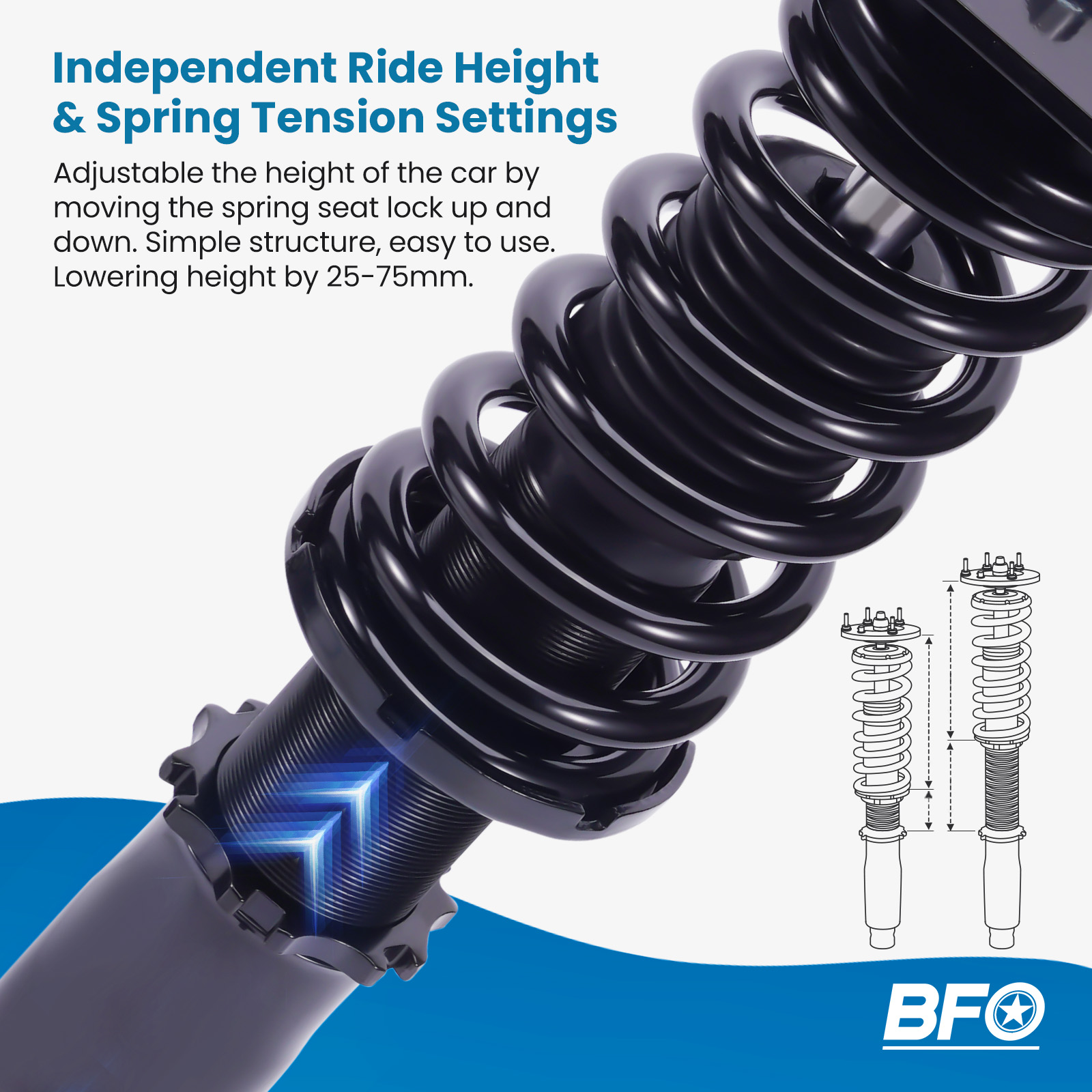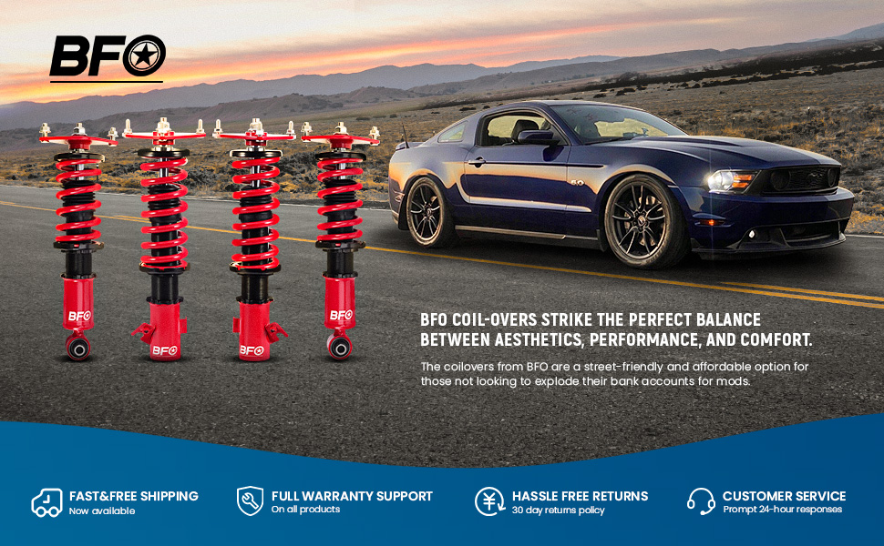 Height Adjustable Lowering Kit; Independent Ride Height And Spring Tension Settings; High Rigidity 55CrSi Steel Cold-bent Springs; Anodized Shock Body With Anti-Corrosion Coating; Full 1 Year Limited Warranty From Date Of Purchase.