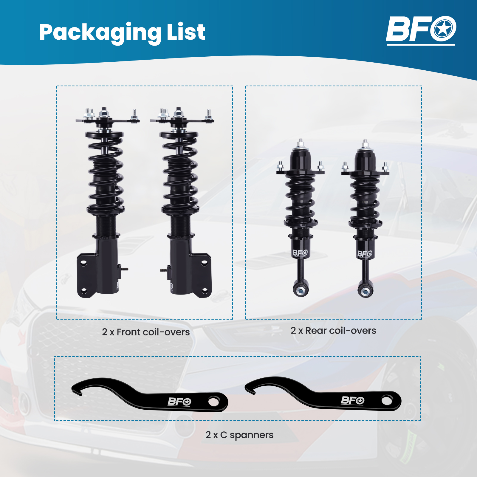 2x Front coil-overs 2x Rear coil-overs 1x Allen wrench 2x C spanners