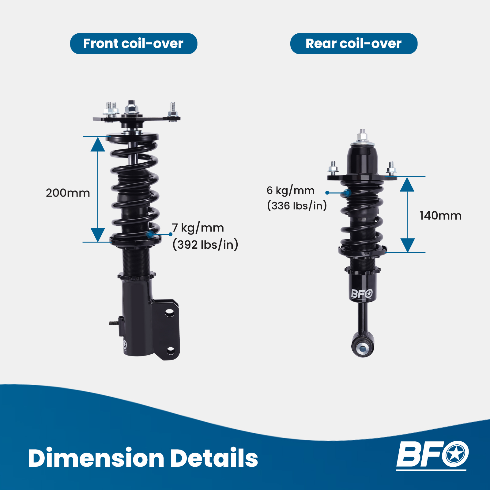- Height adjustable: Yes, lowering 25-75mm depending on the vehicle models - Spring rate Front: 7 kg/mm (392 lbs/in) - Spring rate Rear: 6 kg/mm(336 lbs/in) - Spring length Front: 200 mm - Spring length Rear: 140 mm - Spring Preload advised: 7-10 mm - Color: Black body with black spring