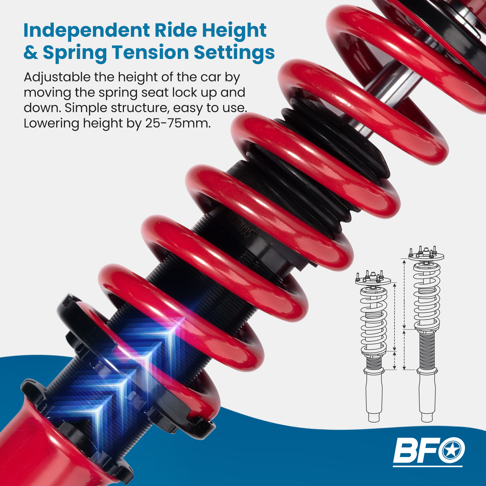 - Height adjustable: Yes, lowering 25-75mm depending on the vehicle models