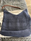 Vintage The Sak Navy Blue Crochet Purse Shoulder Bag Leather Strap Hobo 16”x16”x