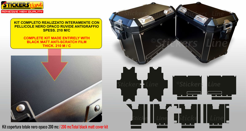 Complete kit of 210 micron anti-scratch stickers to make BMW side cases completely matt black (as shown in the photo), this kit completely covers the sides including the lid, guaranteeing high protection! ensuring perfect adhesion and high resistance against bad weather, scratches and abrasions of various kinds, where these films are applied, your motorbike's suitcases will always be like new, covering those ugly and unsightly stains that are usually created on raw aluminium! " the kit you will receive is easy to assemble because it is as large as the fronts of the bags, just follow the joints already present in the stickers, significantly improving the aesthetics of your motorbike! They can also be applied to suitcases that are already black from the factory!