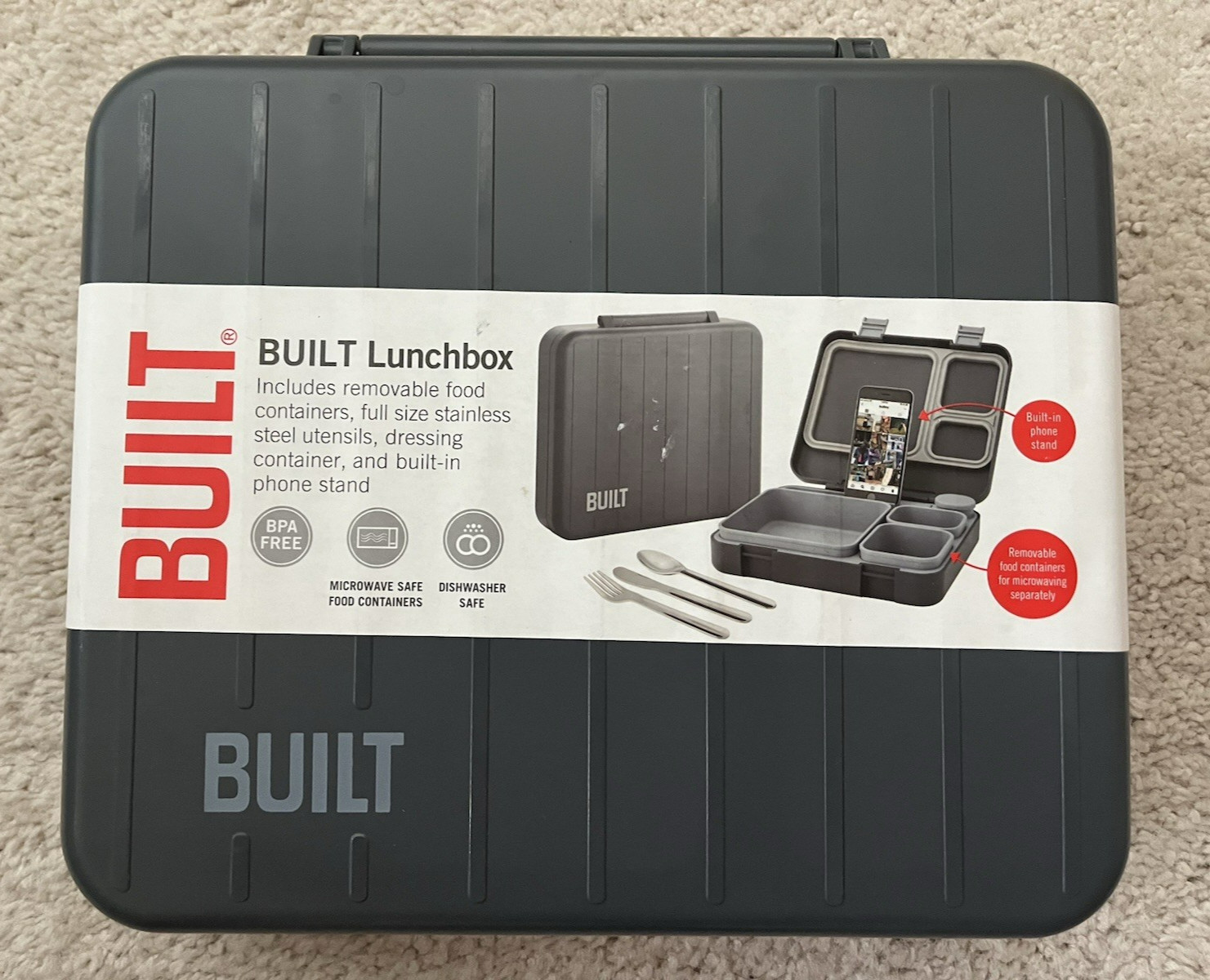 BUILT Reusable Gray Lunch Box Storage 3 REMOVABLE Food Containers & Phone Stand