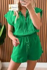 Bright Green Textured Short Sleeve Half Zip Drawstring Elastic Waistband Romper