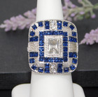 Deco Style Square Silver Tone Blue Clear Rhinestone Statement Cocktail Ring Sz 6
