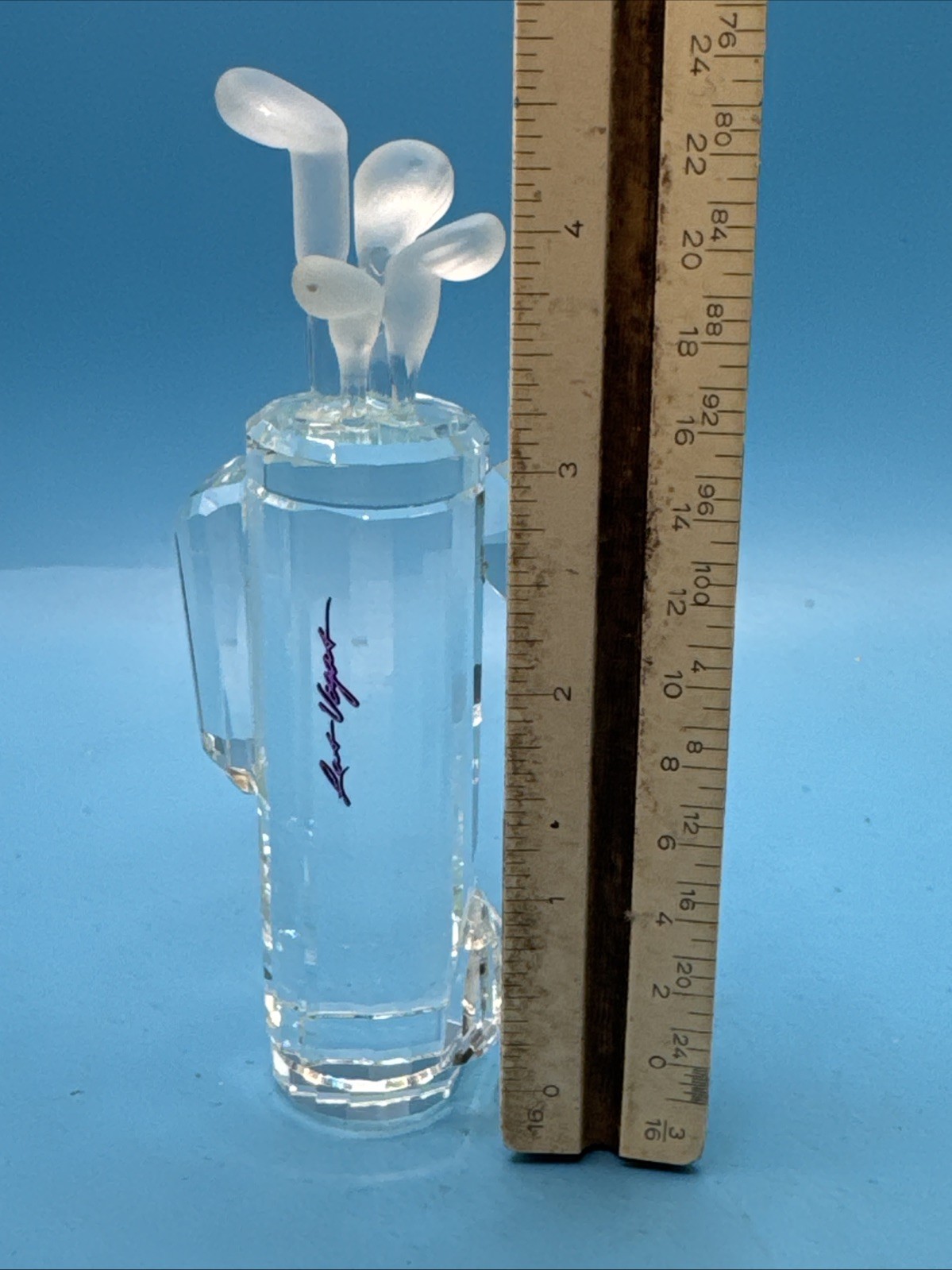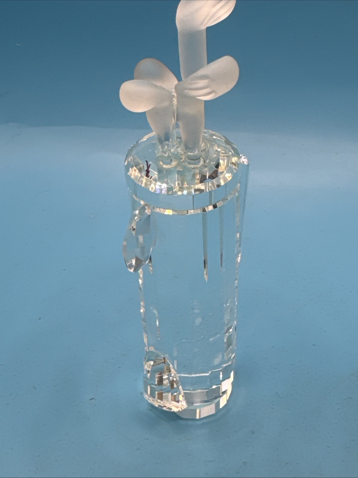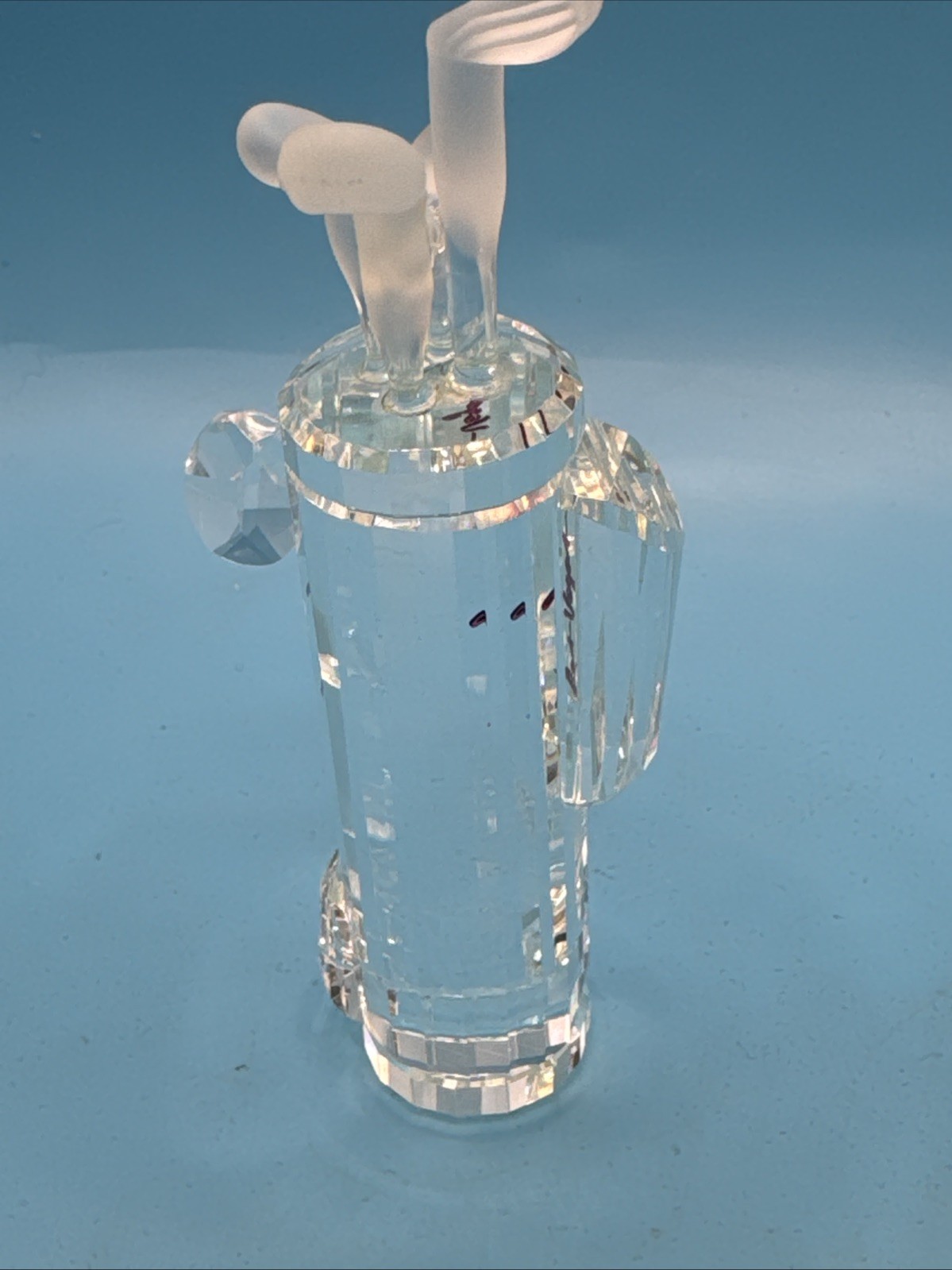 It is crafted from clear crystal with a frosted finish on the golf club tops.