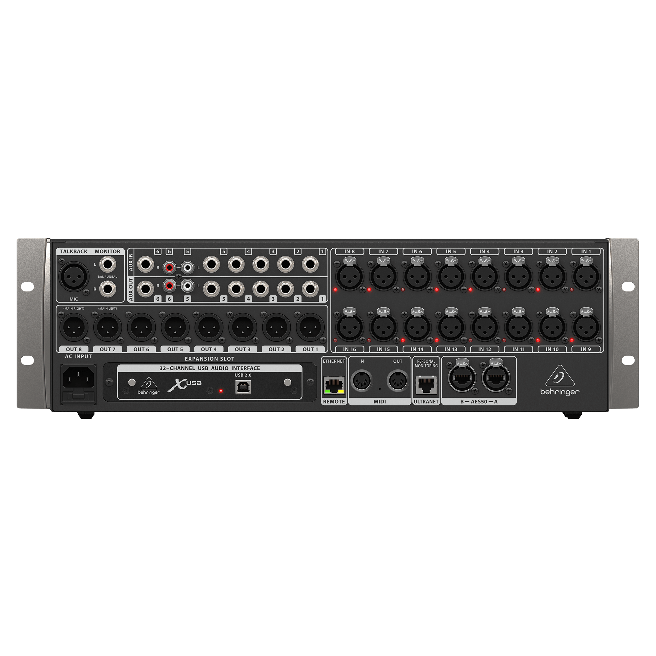 X32 RACK includes an array of control and networking capabilities as standard features. Dual-port AES50 digital networking supports up to 96 channels of audio over shielded (STP) CAT5 cable, allowing remote stage boxes and sharing signals among several connected X32 RACKs. Onboard ULTRANET provides a 16-channel digital mix direct to P16 Personal Monitor Mixers, without added hardware, cost or latency. Ethernet, USB 2.0, MIDI – all standard features on the X32 RACK.