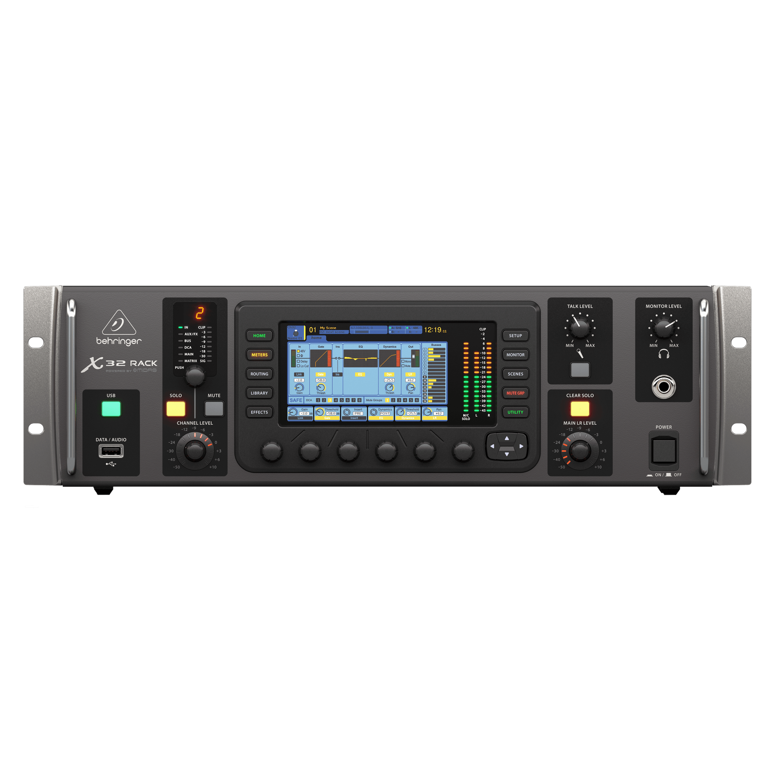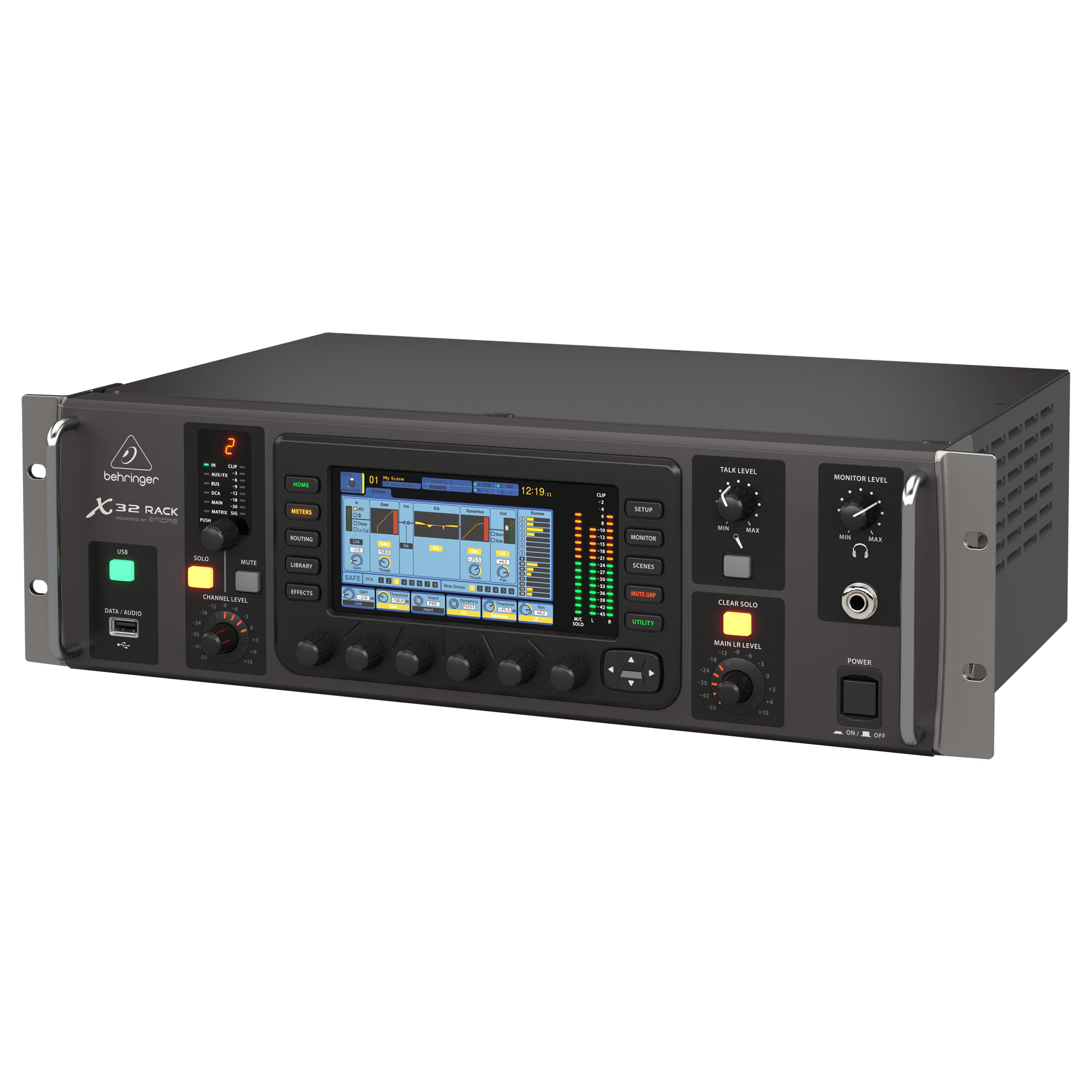 X32 RACK’s 5" day-viewable color TFT (Thin-Film Transistor) display shows the setting parameters you need when you need them.