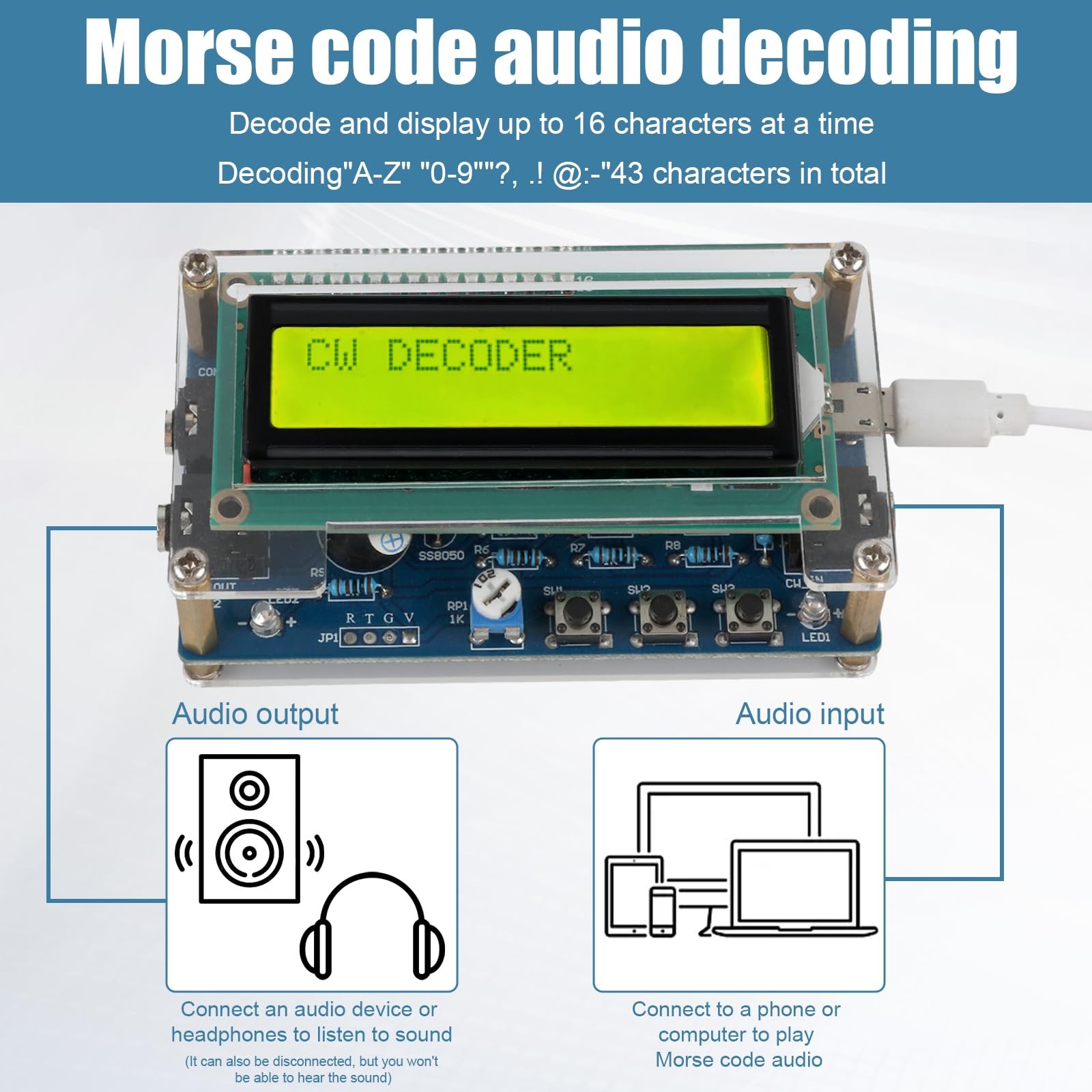 [Morse Code Decoder Soldering Kit] This kit's end product is a handy Morse code decoder and an excellent tool for learning and practice. By soldering and assembling it yourself, you'll grasp Morse code fundamentals and apply them to real decoding.