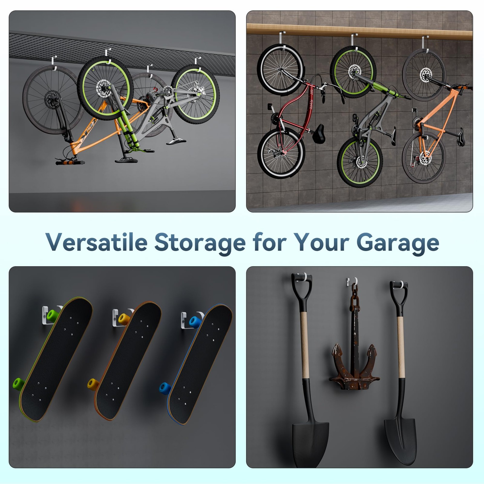 【Multi-Purpose Storage】: These bike hooks for garage ceiling are perfect for hanging bicycles, scooters, garden tools, sports equipment, and more, offering versatile storage solutions for your garage or warehouse