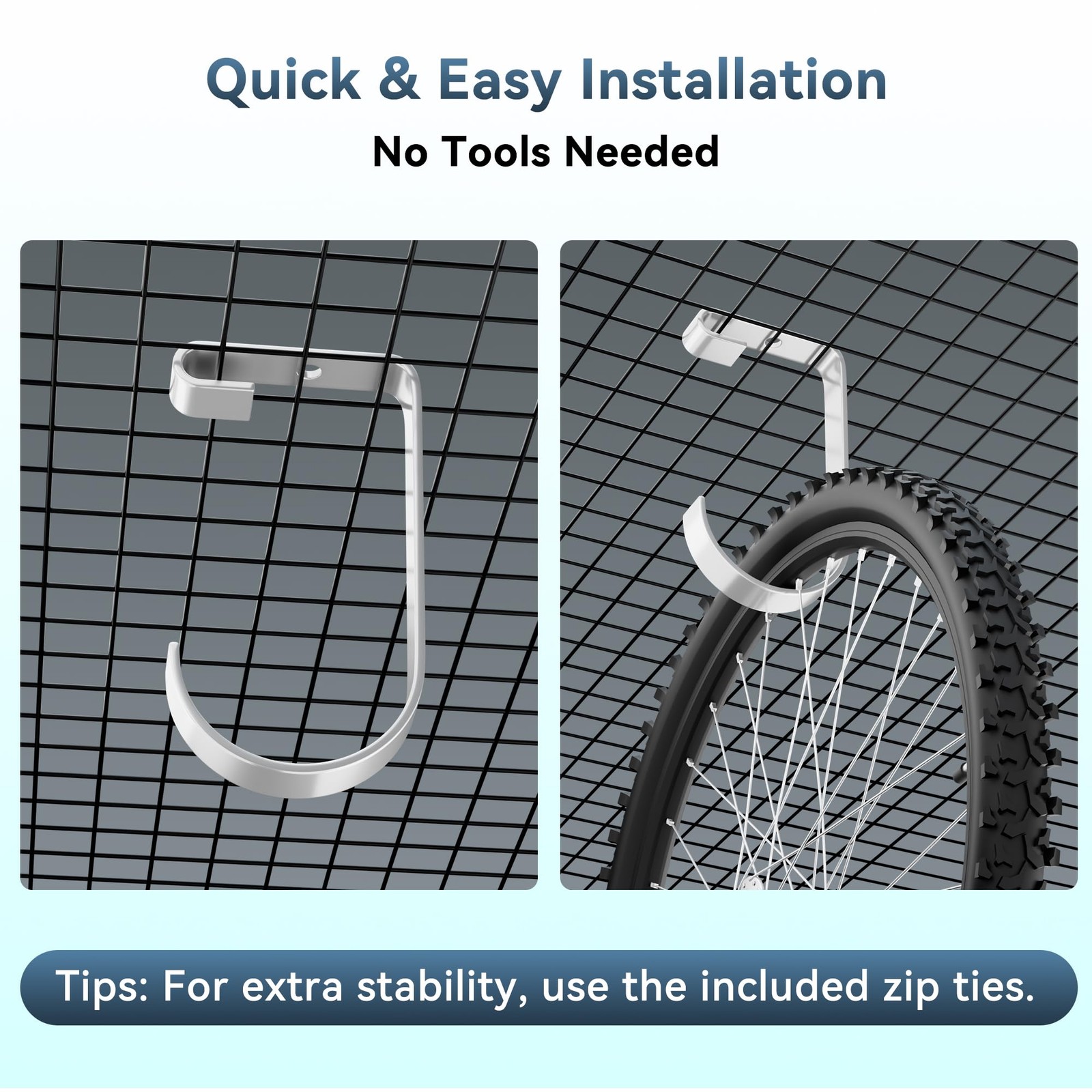 【Stable Design】: The widened clip design allows the bike hangers for garage to securely hang on overhead storage racks. Included zip ties help further stabilize the hooks and reduce wobbling when taking items down. The wide curved hook surface increases area for a stronger grip and prevents items from slipping