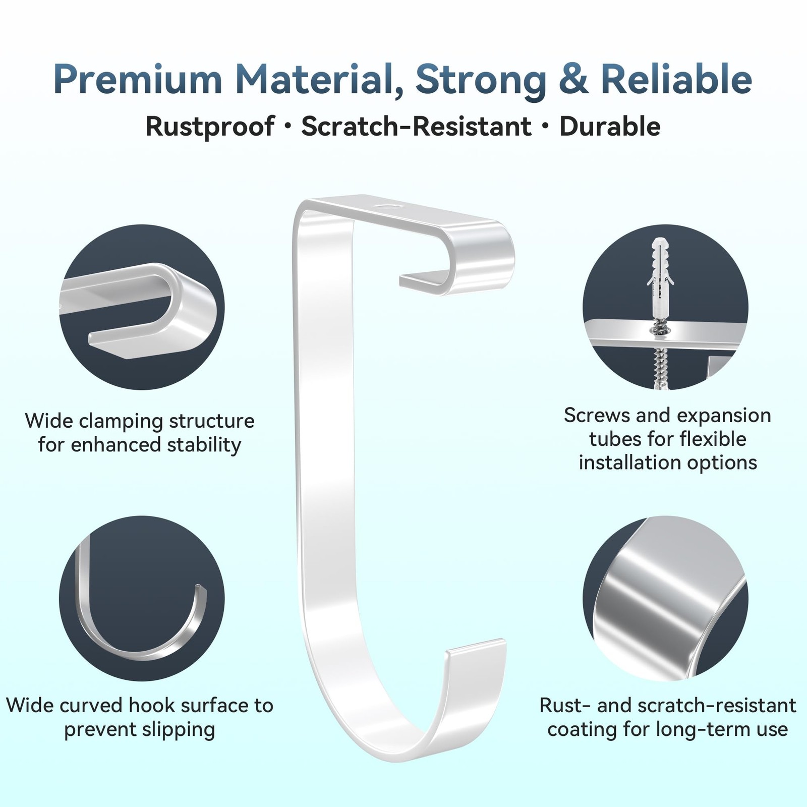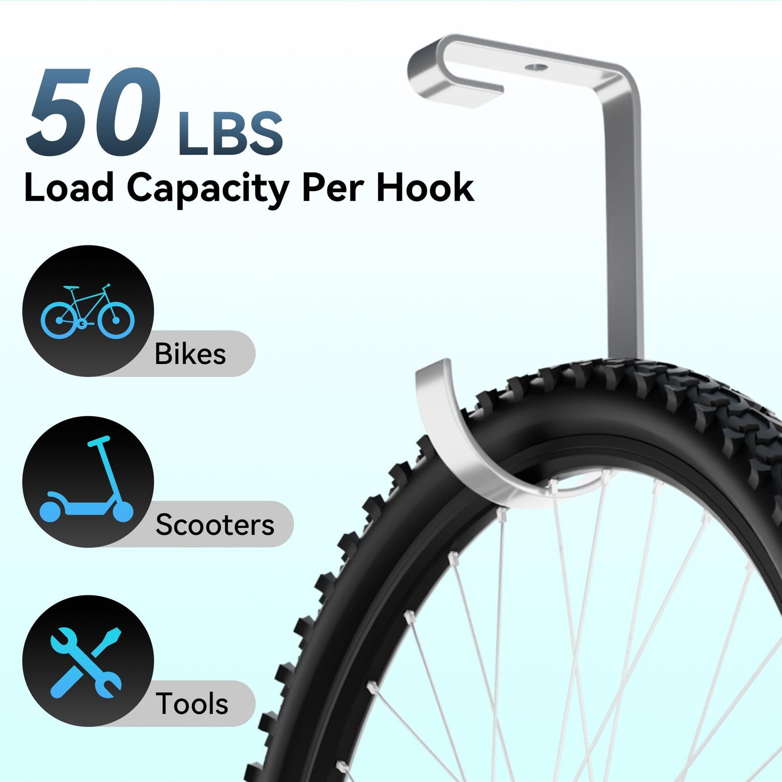 【Durable & High Load Capacity】: bike hooks for garage are made of high-quality solid steel for exceptional strength and durability. Each bike hanger supports up to 50 lbs without bending. The high-temperature powder-coated finish provides excellent resistance to rust, scratches, and moisture, making them ideal for use in garages, basements, or sheds
