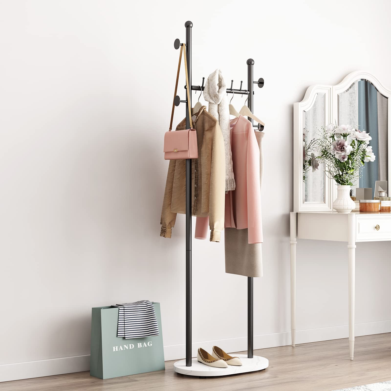 【Practical Clothes Rack】 We designed this black coat rack with marble base, which is composed of high-end metal and elegant marble. Coat rack tree freestanding have 5 top-hooks, 4 side-hooks, for a total of 9 hooks for hanging your hats, bags, scarves, and top rails for hanging your clothes. Solid marble base for you to decorate, or place your high heels, etc.