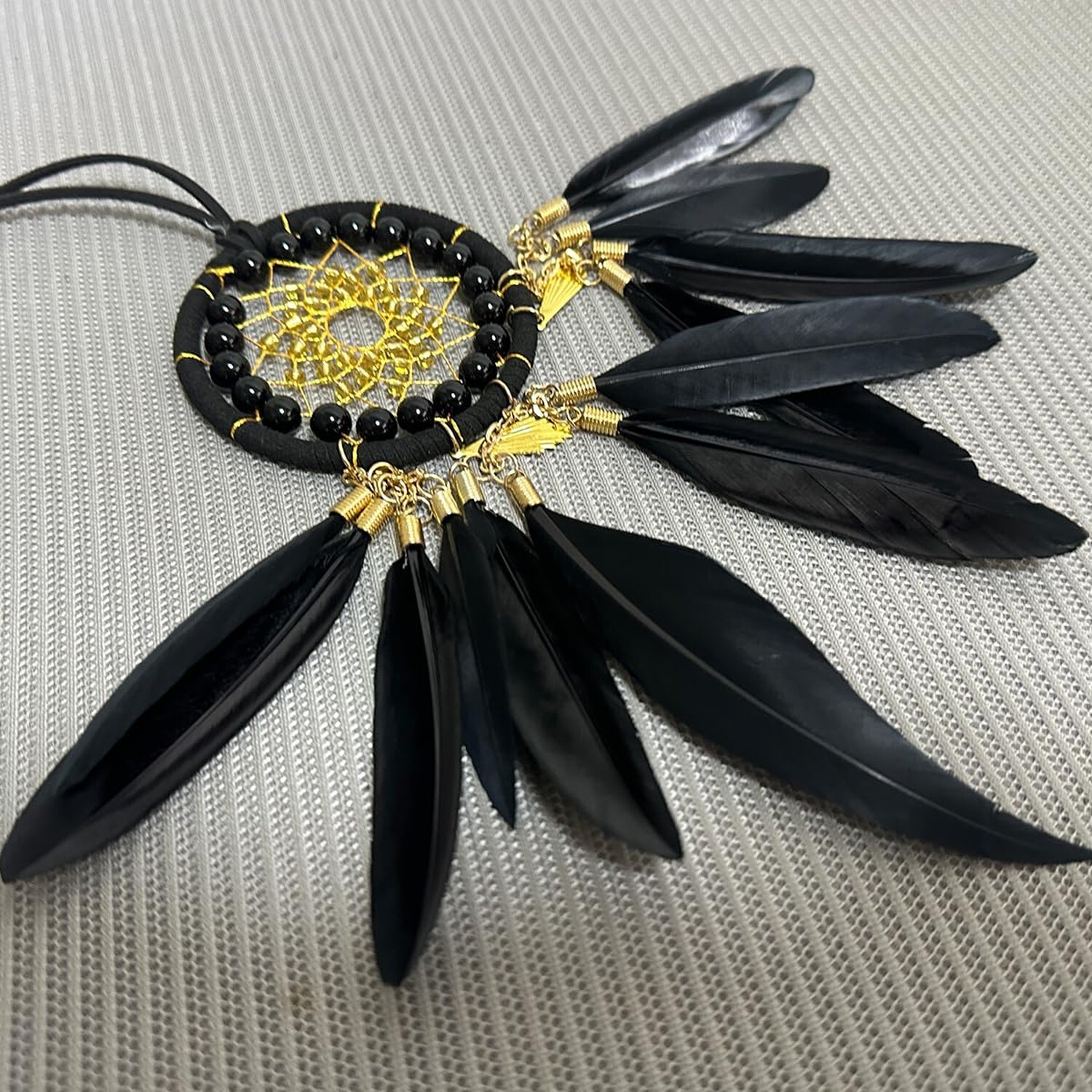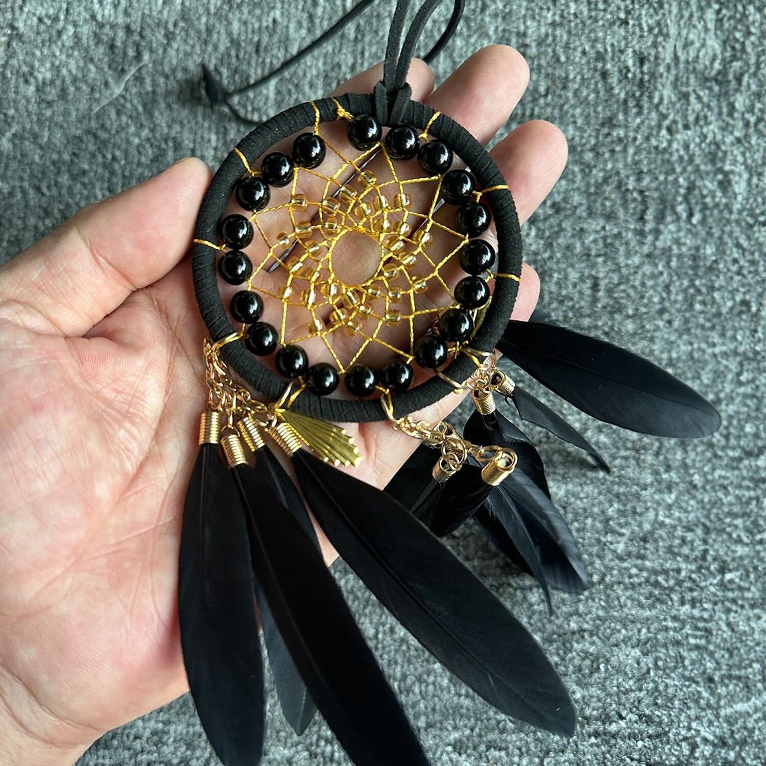 Exquisite Material: AWLEE black car dream catcher is made of high-quality materials. The ring is made of metal and wrapped with black leather rope. The black beads in the net are matched with yellow transparent beads, and there is a gold thread net, the color matching is atmospheric, and under the net is a gold ring connected to the black feathers that have been fumigated at high temperature. All crafts are handmade to create unique works.