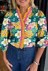 Green Plus Size Floral Print Contrast Trim V Neck Bracelet Sleeve Blouse