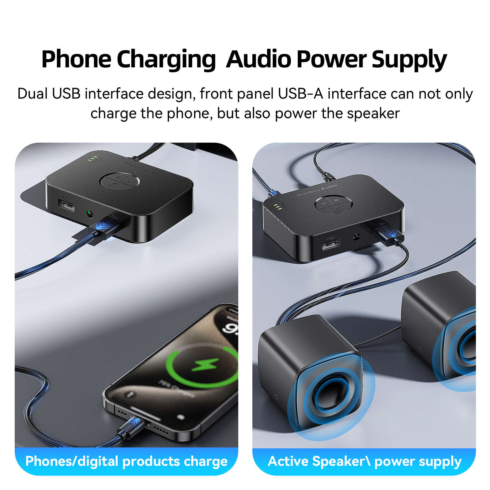 Dual USB Interface Design: The front panel is equipped with two USB interfaces. The left USB supports USB flash drive playback, while the right USB is designed for charging digital devices such as mobile phones. With one device serving two purposes, it eliminates the need for an extra charger and simplifies your desktop