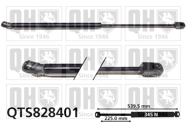 | Brand | Quinton Hazell | | Length | 540 mm | | Housing Diameter | 18 mm | | Eject Force | 345 N | | Stroke | 225 mm | | Piston conrod diameter | 8 mm | | Type | Gas Spring, boot/cargo area |