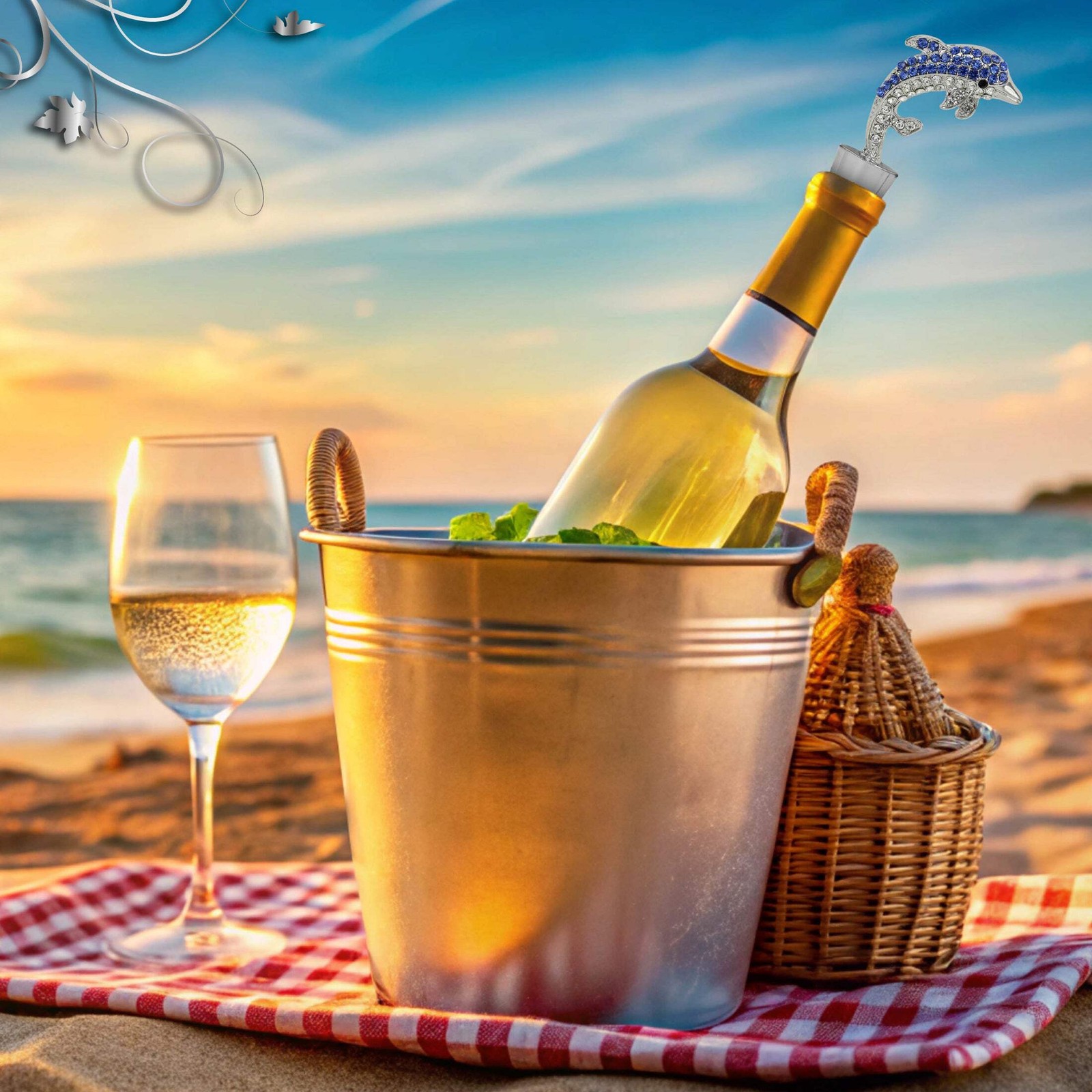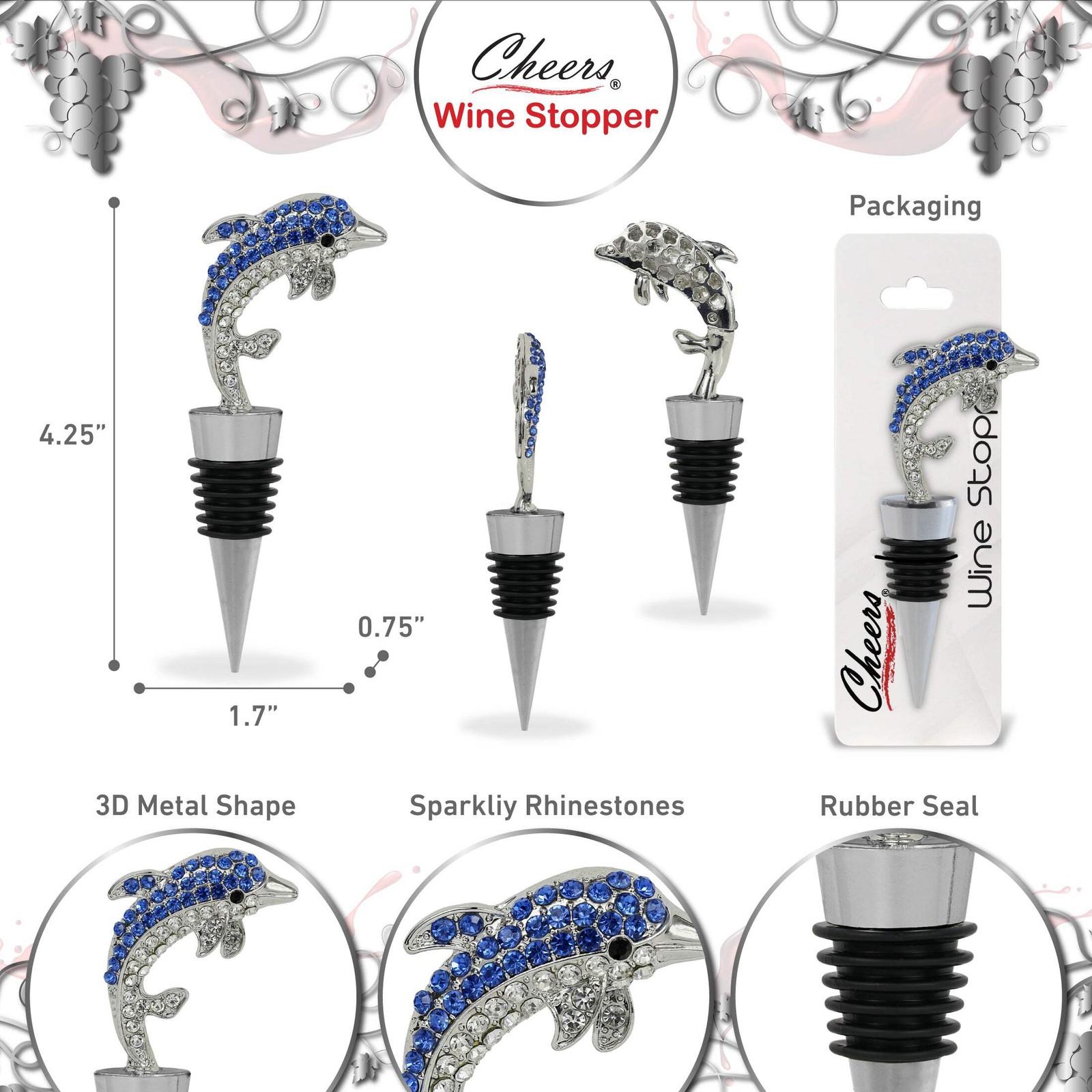 - Features Sparkling Wine Bottle Stopper Dolphin with Rhinestone Crystals - This elegant dolphin stopper is adorned with shimmering blue rhinestones, making it a standout crystal wine stopper. It transforms ordinary bottles into a statement conversation starter by creating an enhanced wine bottle decor. The silver dolphin decorative wine bottle stopper is perfect for daily use or parties. A reusable wine bottle stopper to keep your wines fresh.