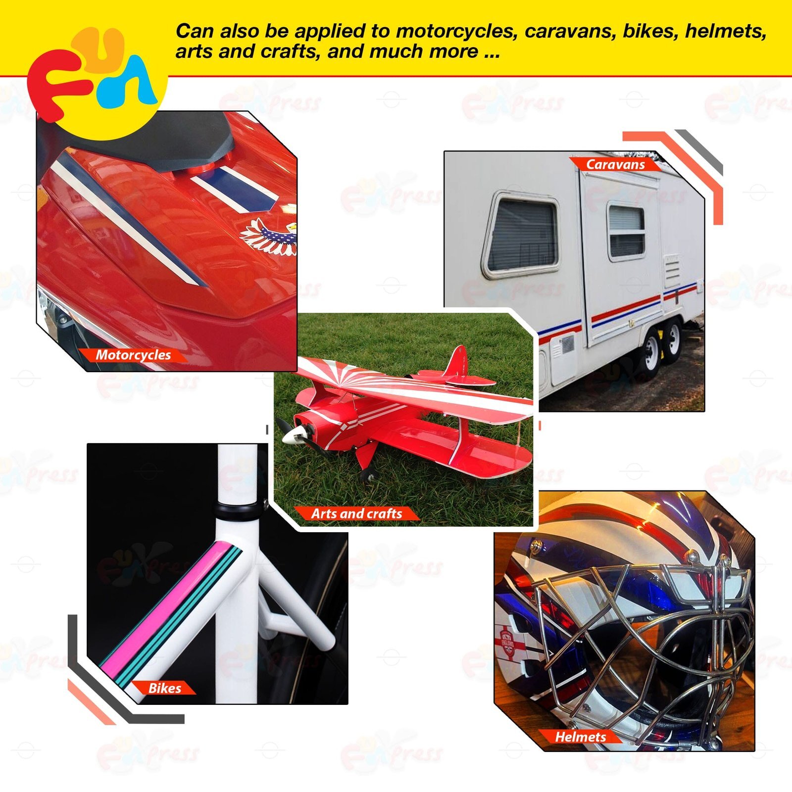 FITMENT : Universally applicable for vehicle bodies; only for straight-line (non-curvilinear) applications Applicable to motorcycles, caravans, bikes, helmets, arts and crafts, and much more Not applicable for use on wheel rims, rubber moulding, textured paint, fiberglass, unfinished wood or porous surfaces, etc.