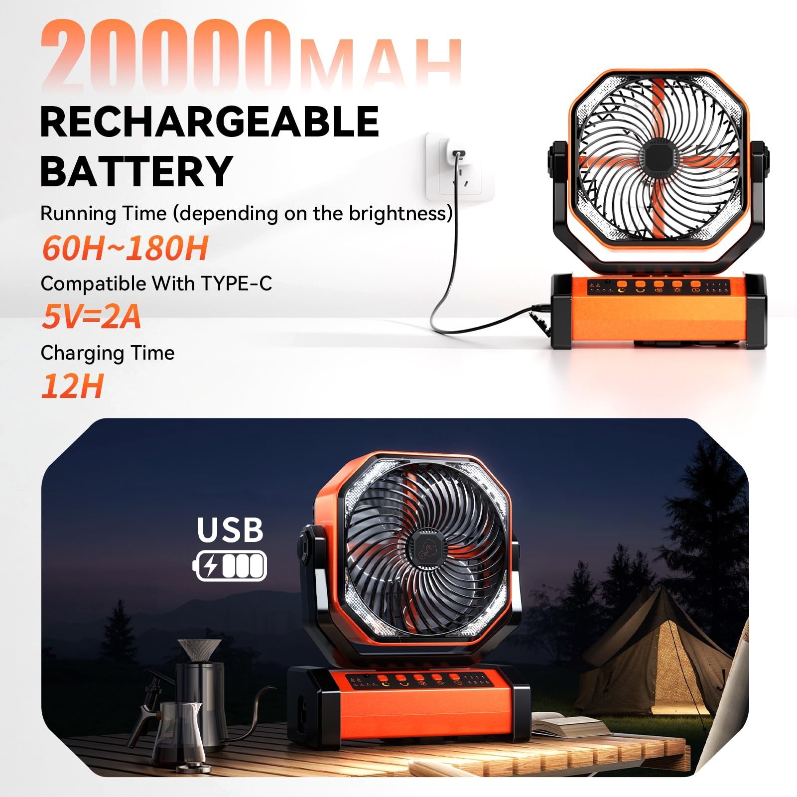 Camping LED Fan with Light, 20000mAh Rechargeable Battery Powered Outdoor Tent Fan with Light and Hook, 4 Speed, Personal USB Desk Fan for Camping, Fishing, Power Outage,Hurricane, Worksite