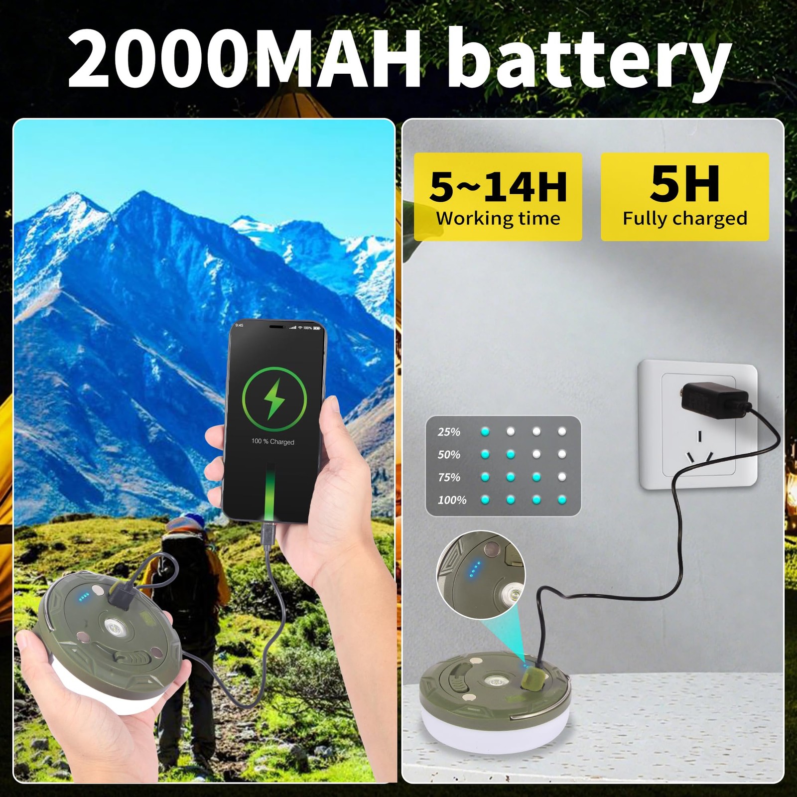 【Long-lasting rechargeable battery & Other with any Type-C cable】Say goodbye to disposable batteries! Our camping light features a built-in 2000mAh rechargeable battery for long-lasting use—just a 3-hour charge (compatible with other Type-C chargers) provides 5-13 hours of continuous operation depending on the selected lighting mode. This ensures reliable use during long camping trips, festivals, or power outages. A built-in USB charging port also allows you to charge your phone (using our included charging cable). A clear power indicator eliminates guesswork: a flashing blue light shows the charging status at a glance.